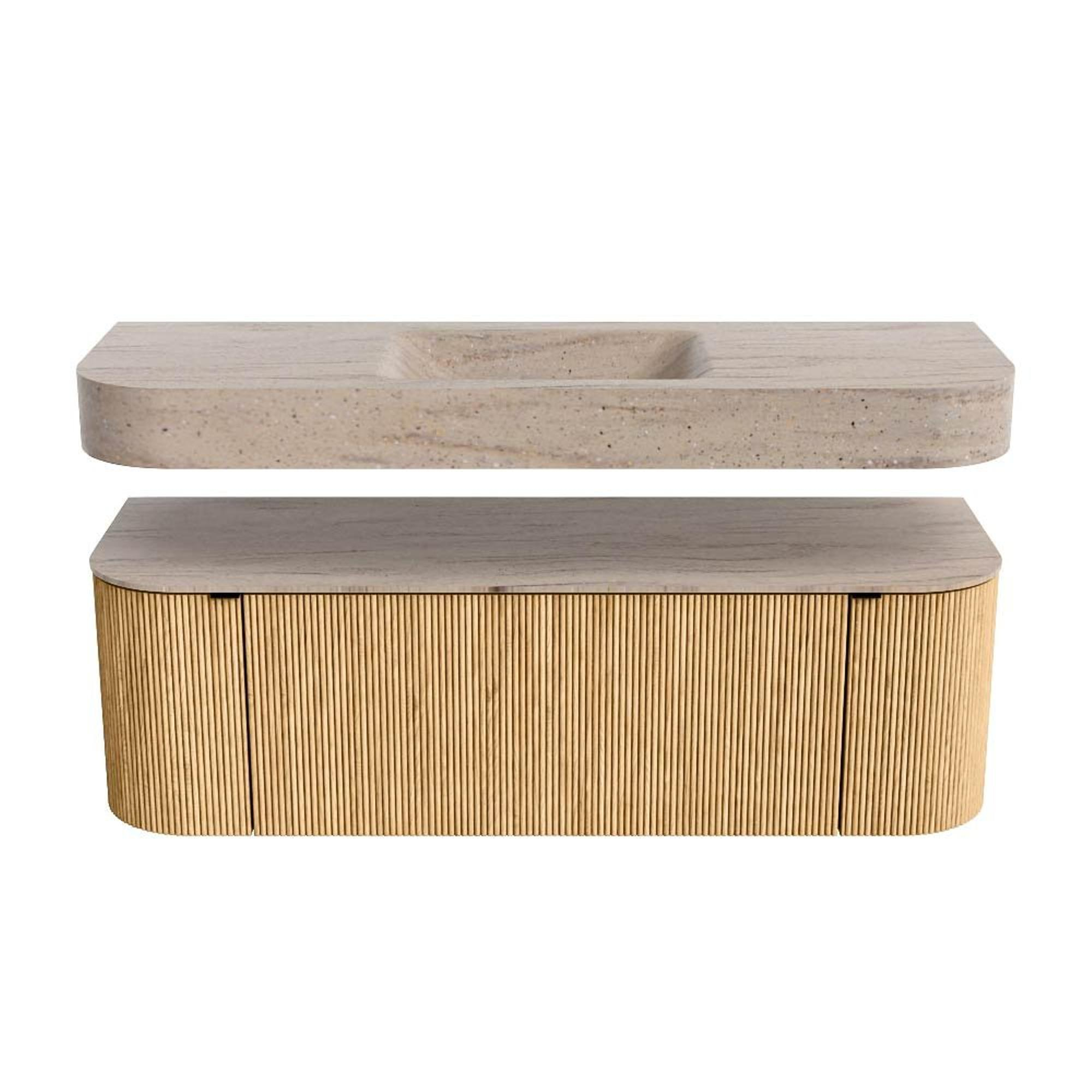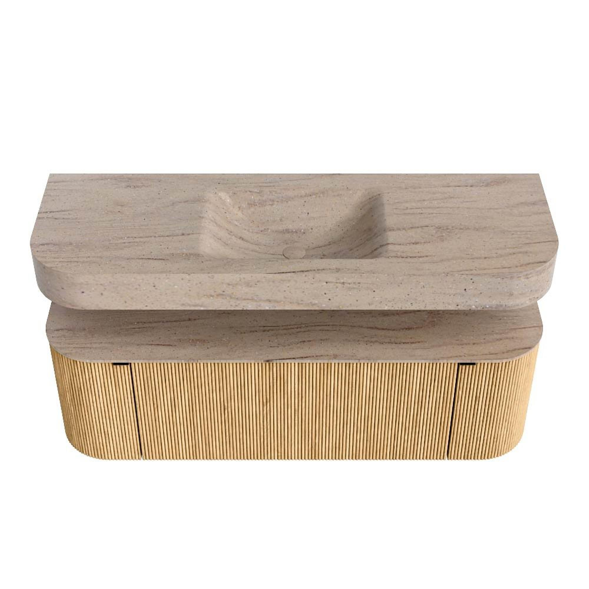 Boven het meubel zweeft een bijpassende, vrij hangende wastafel met afgeronde hoeken – perfect afgestemd op de vorm van de kast. De wastafel is uitgevoerd in Solid Surface en volgt subtiel de lijnen van het onderliggende meubel, waardoor een harmonieus geheel ontstaat. Het Solid Surface topblad vormt een sterke, onderhoudsvriendelijke basis en maakt de combinatie compleet.