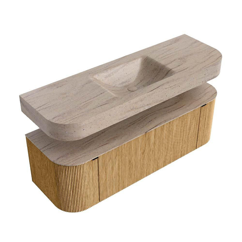 MONDIAZ THOR-DLUX 140cm badmeubel ronding links + rechts kleur Oak met 1 lade en 2 deuren. Vrijhangende wastafel CLOUD Midden zonder kraangat kleur Saba.