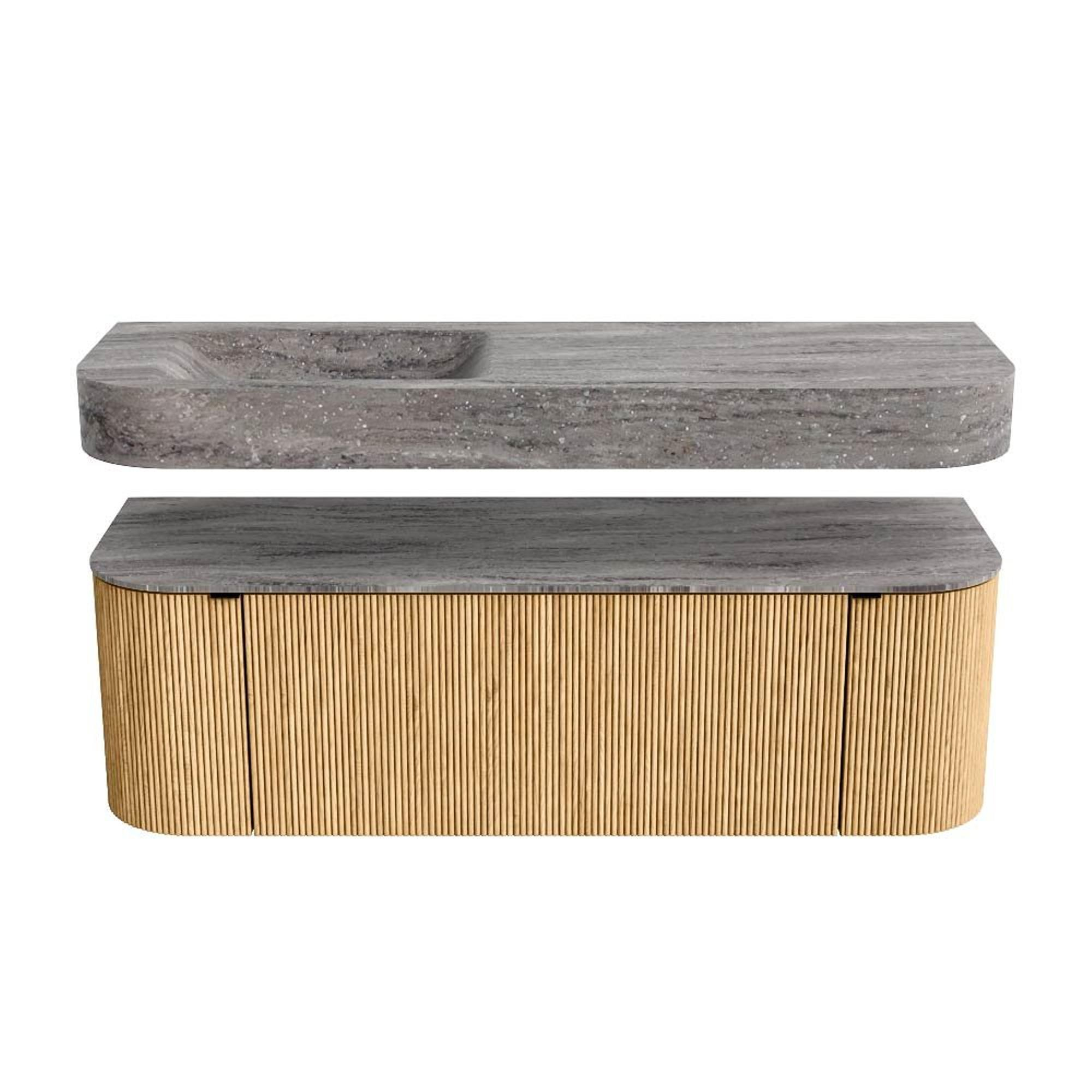 MONDIAZ THOR-DLUX 140cm badmeubel ronding links + rechts kleur Oak met 1 lade en 2 deuren. Vrijhangende wastafel CLOUD Links 1 kraangat kleur Oza.