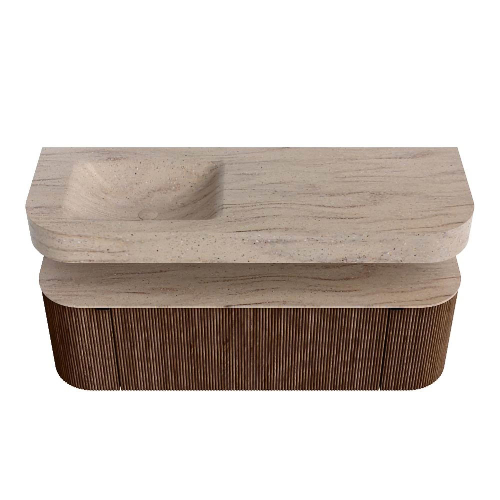 MONDIAZ THOR-DLUX 140cm badmeubel ronding links + rechts kleur Walnut met 1 lade en 2 deuren. Vrijhangende wastafel CLOUD Links zonder kraangat kleur Saba.