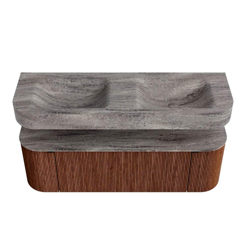 MONDIAZ THOR-DLUX 140cm badmeubel ronding links + rechts kleur Ruby met 1 lade en 2 deuren. Vrijhangende wastafel CLOUD Dubbel zonder kraangat kleur Oza.