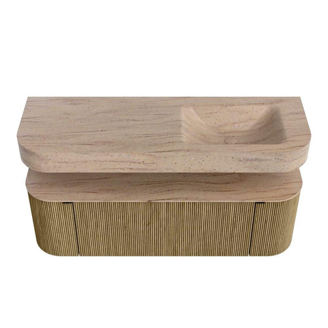 Boven het meubel zweeft een bijpassende, vrij hangende wastafel met afgeronde hoeken – perfect afgestemd op de vorm van de kast. De wastafel is uitgevoerd in Solid Surface en volgt subtiel de lijnen van het onderliggende meubel, waardoor een harmonieus geheel ontstaat. Het Solid Surface topblad vormt een sterke, onderhoudsvriendelijke basis en maakt de combinatie compleet.