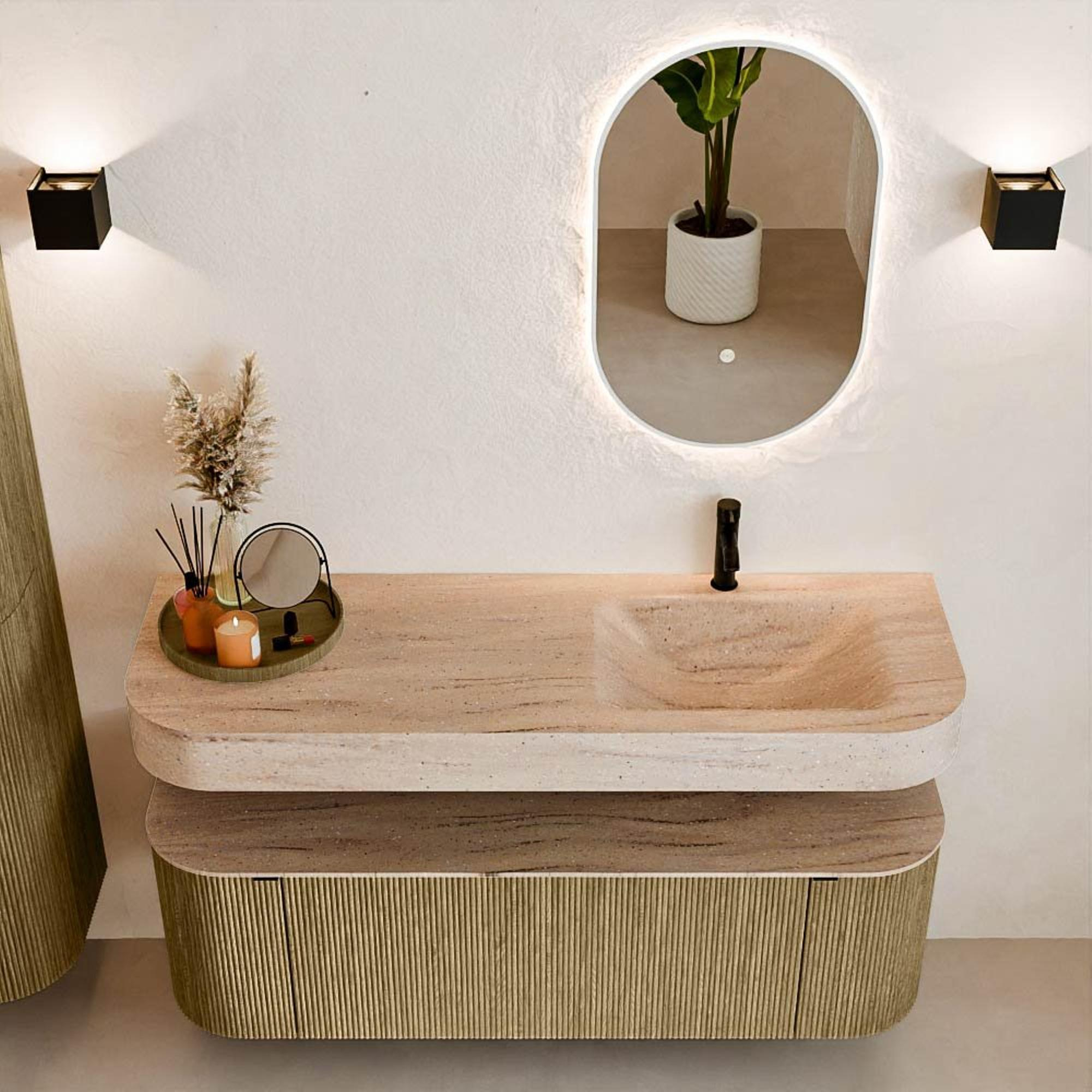 Natuurlijke materialen in warme tinten. De verticale ribbels brengen ritme en textuur in het ontwerp, terwijl het eikenhout zorgt voor een warme, ambachtelijke uitstraling. Kies uit 5 houttinten OAK, WALNUT, DUSK, SHADOW en RUBY zorgvuldig geselecteerde houtkleuren om zowel moderne als klassieke badkamers te verrijken.