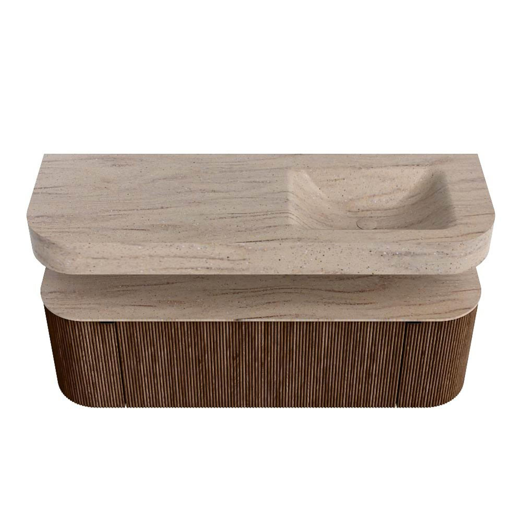 MONDIAZ THOR-DLUX 140cm badmeubel ronding links + rechts kleur Walnut met 1 lade en 2 deuren. Vrijhangende wastafel CLOUD Rechts 1 kraangat kleur Saba.