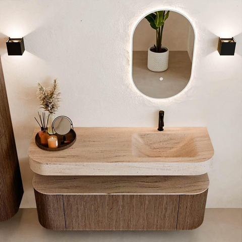 Natuurlijke materialen in warme tinten. De verticale ribbels brengen ritme en textuur in het ontwerp, terwijl het eikenhout zorgt voor een warme, ambachtelijke uitstraling. Kies uit 5 houttinten OAK, WALNUT, DUSK, SHADOW en RUBY zorgvuldig geselecteerde houtkleuren om zowel moderne als klassieke badkamers te verrijken.
