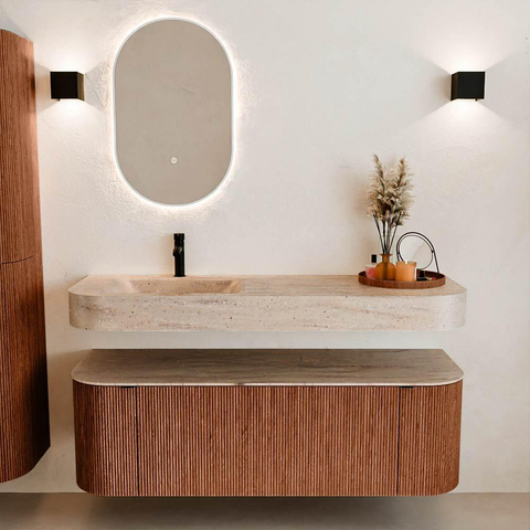 Natuurlijke materialen in warme tinten. De verticale ribbels brengen ritme en textuur in het ontwerp, terwijl het eikenhout zorgt voor een warme, ambachtelijke uitstraling. Kies uit 5 houttinten OAK, WALNUT, DUSK, SHADOW en RUBY zorgvuldig geselecteerde houtkleuren om zowel moderne als klassieke badkamers te verrijken.