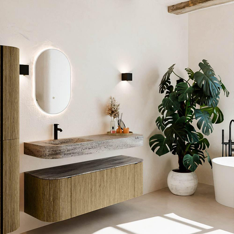 Natuurlijke materialen in warme tinten. De verticale ribbels brengen ritme en textuur in het ontwerp, terwijl het eikenhout zorgt voor een warme, ambachtelijke uitstraling. Kies uit 5 houttinten OAK, WALNUT, DUSK, SHADOW en RUBY zorgvuldig geselecteerde houtkleuren om zowel moderne als klassieke badkamers te verrijken.