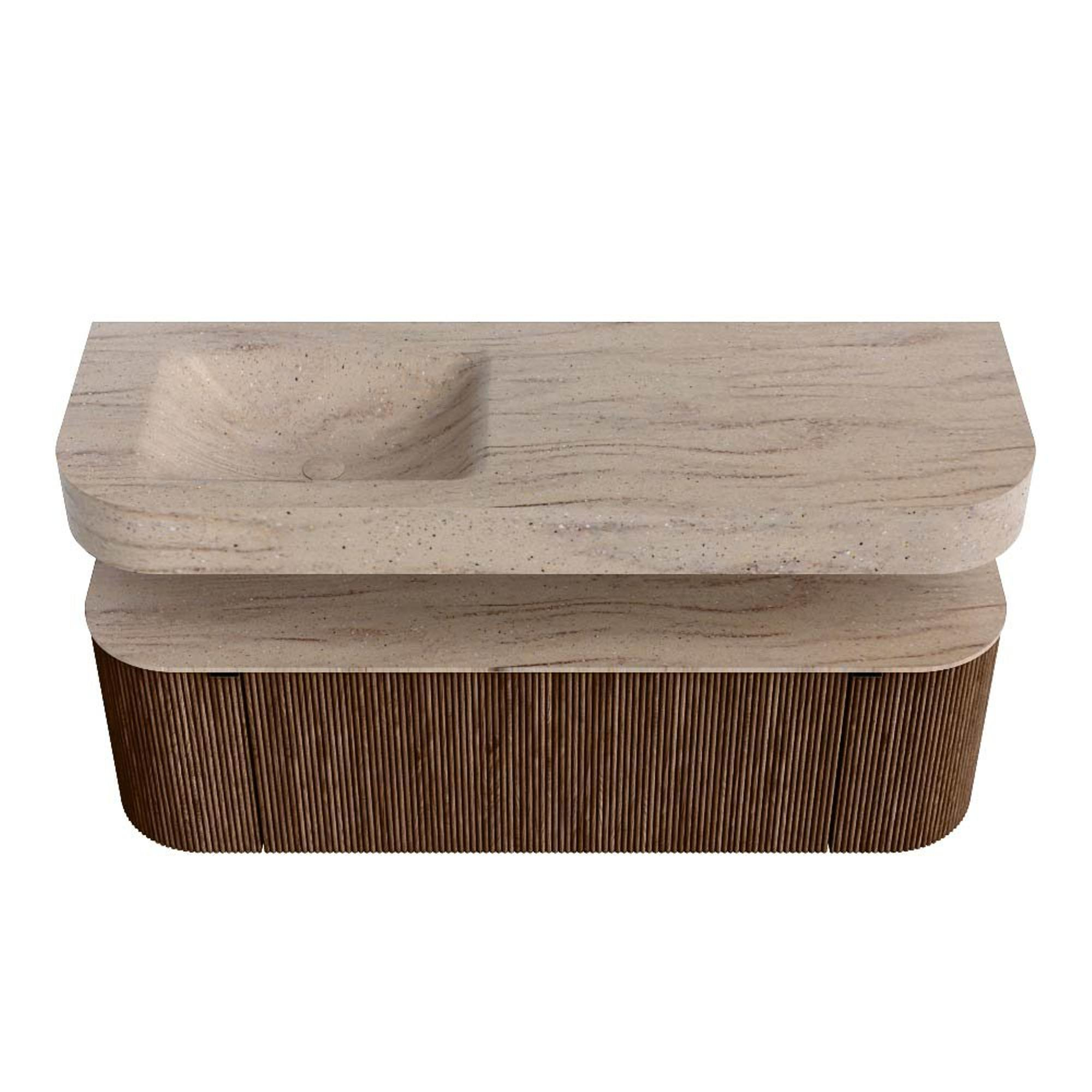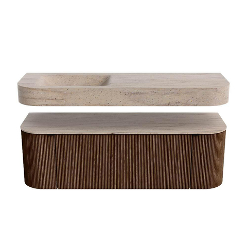 MONDIAZ THOR-DLUX 140cm badmeubel ronding links + rechts kleur Walnut met 1 lade en 2 deuren. Vrijhangende wastafel CLOUD Links 1 kraangat kleur Saba.