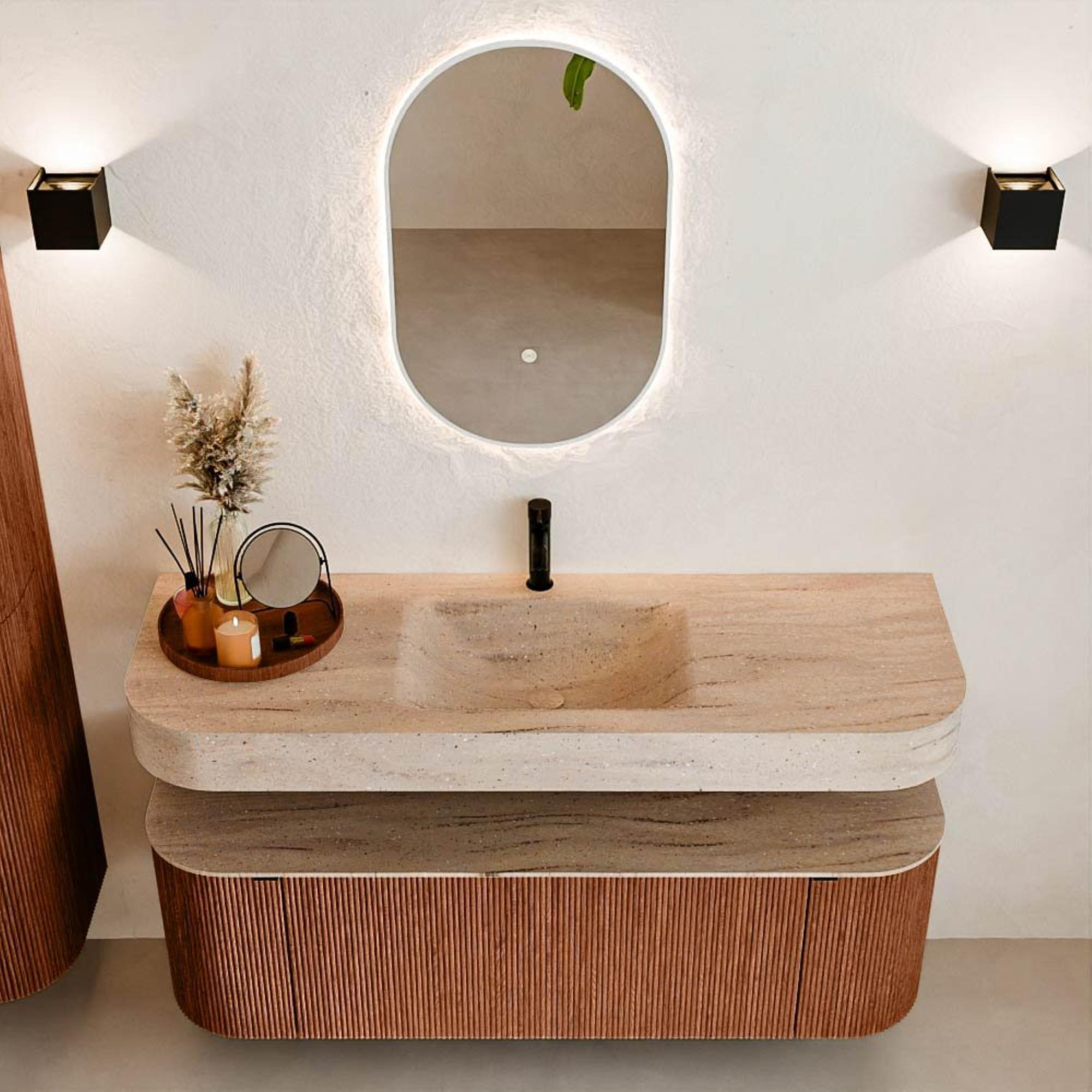 Natuurlijke materialen in warme tinten. De verticale ribbels brengen ritme en textuur in het ontwerp, terwijl het eikenhout zorgt voor een warme, ambachtelijke uitstraling. Kies uit 5 houttinten OAK, WALNUT, DUSK, SHADOW en RUBY zorgvuldig geselecteerde houtkleuren om zowel moderne als klassieke badkamers te verrijken.