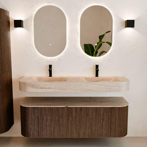 Natuurlijke materialen in warme tinten. De verticale ribbels brengen ritme en textuur in het ontwerp, terwijl het eikenhout zorgt voor een warme, ambachtelijke uitstraling. Kies uit 5 houttinten OAK, WALNUT, DUSK, SHADOW en RUBY zorgvuldig geselecteerde houtkleuren om zowel moderne als klassieke badkamers te verrijken.