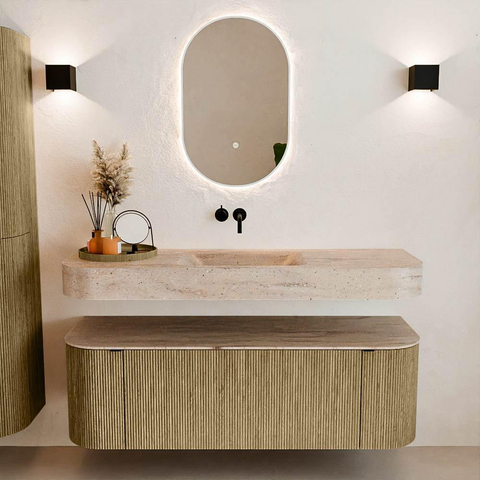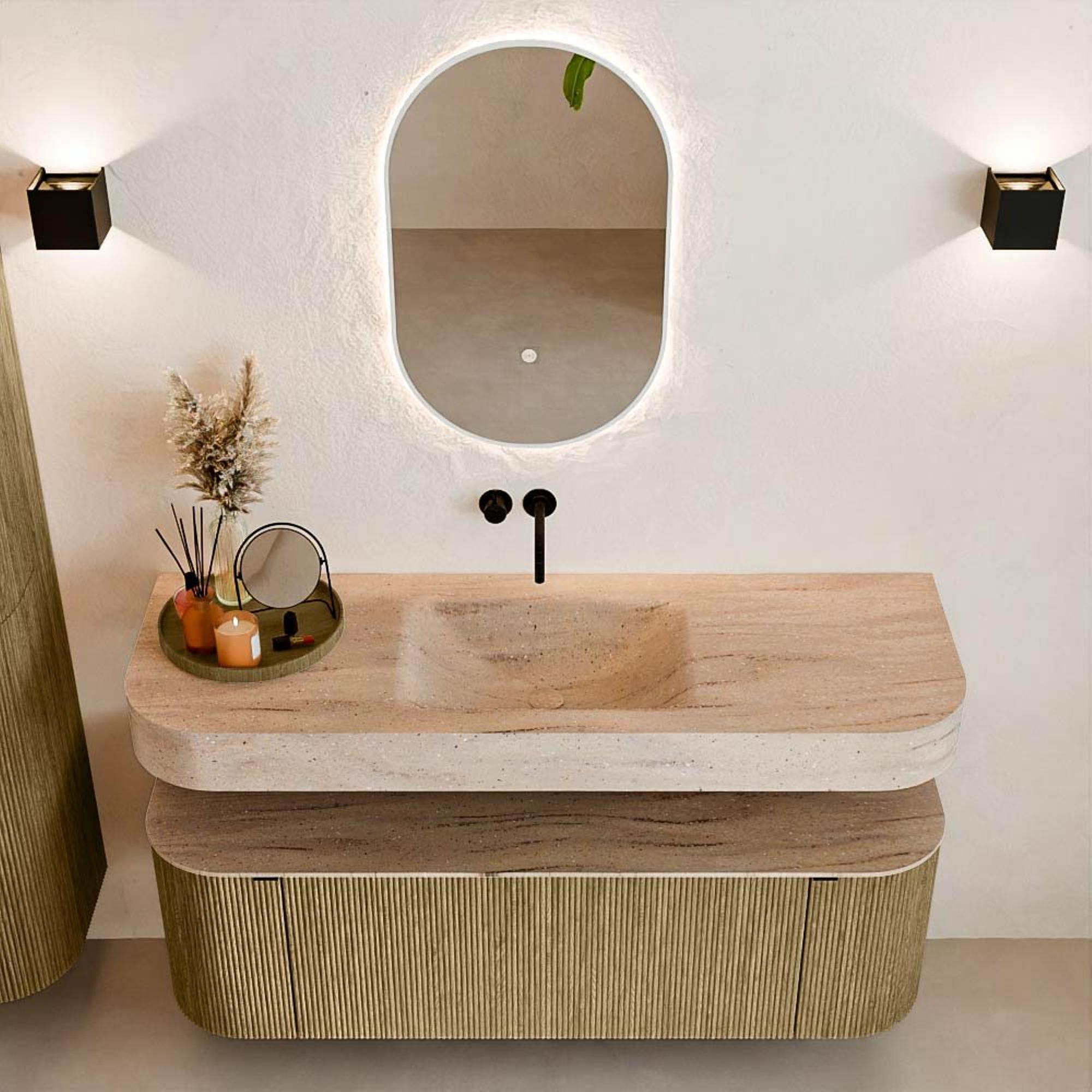 Natuurlijke materialen in warme tinten. De verticale ribbels brengen ritme en textuur in het ontwerp, terwijl het eikenhout zorgt voor een warme, ambachtelijke uitstraling. Kies uit 5 houttinten OAK, WALNUT, DUSK, SHADOW en RUBY zorgvuldig geselecteerde houtkleuren om zowel moderne als klassieke badkamers te verrijken.