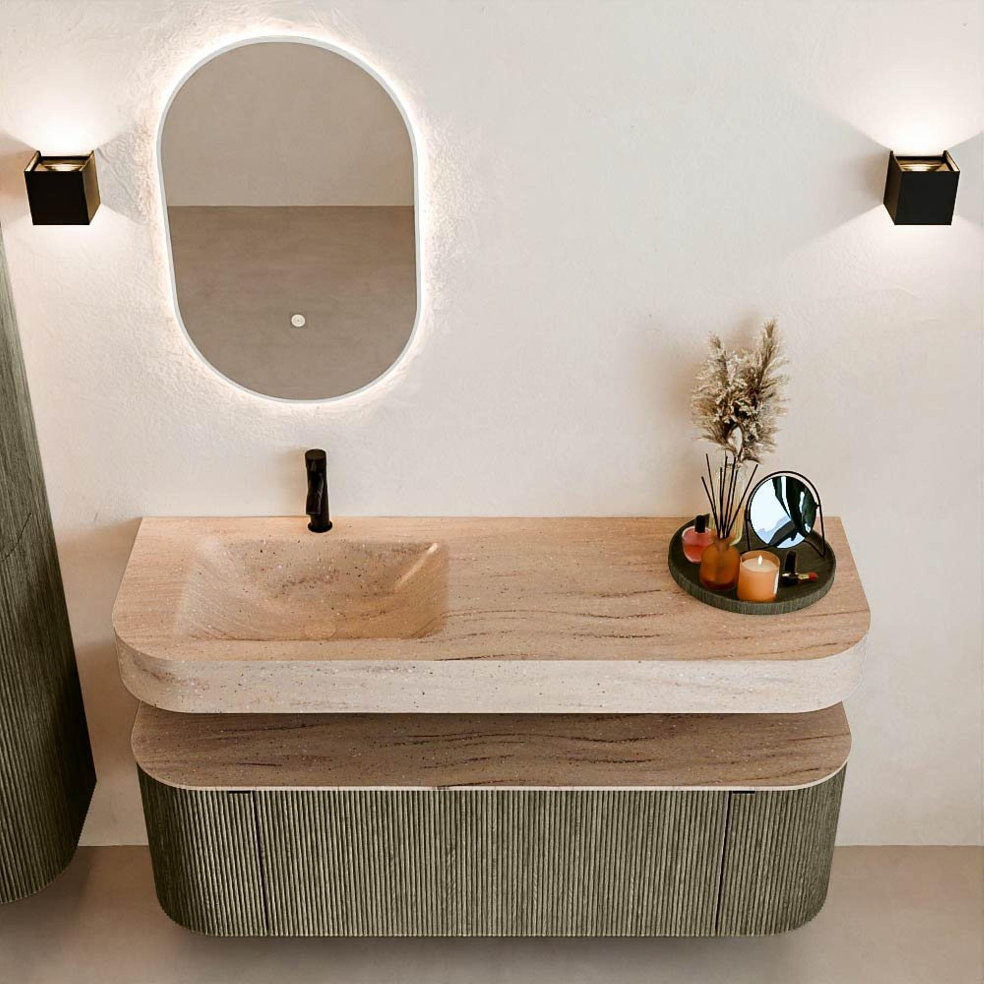 Natuurlijke materialen in warme tinten. De verticale ribbels brengen ritme en textuur in het ontwerp, terwijl het eikenhout zorgt voor een warme, ambachtelijke uitstraling. Kies uit 5 houttinten OAK, WALNUT, DUSK, SHADOW en RUBY zorgvuldig geselecteerde houtkleuren om zowel moderne als klassieke badkamers te verrijken.