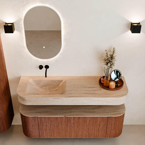 Natuurlijke materialen in warme tinten. De verticale ribbels brengen ritme en textuur in het ontwerp, terwijl het eikenhout zorgt voor een warme, ambachtelijke uitstraling. Kies uit 5 houttinten OAK, WALNUT, DUSK, SHADOW en RUBY zorgvuldig geselecteerde houtkleuren om zowel moderne als klassieke badkamers te verrijken.