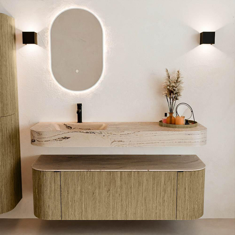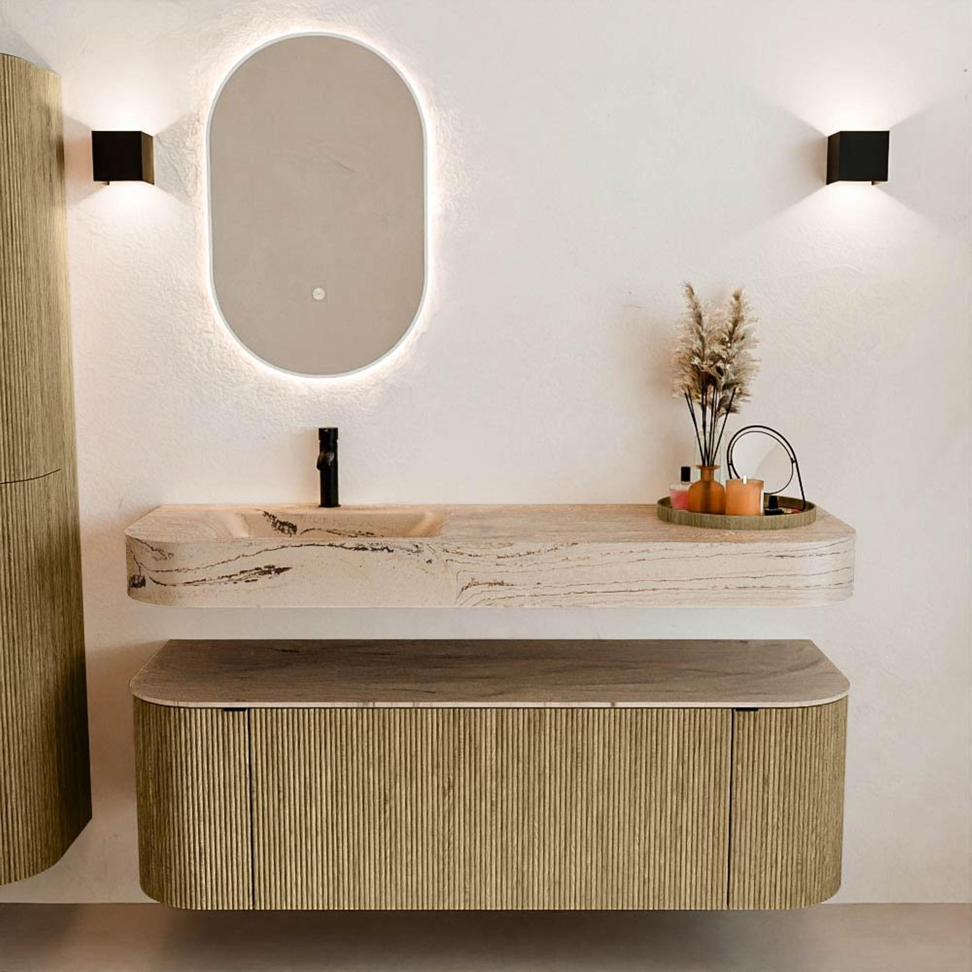 Natuurlijke materialen in warme tinten. De verticale ribbels brengen ritme en textuur in het ontwerp, terwijl het eikenhout zorgt voor een warme, ambachtelijke uitstraling. Kies uit 5 houttinten OAK, WALNUT, DUSK, SHADOW en RUBY zorgvuldig geselecteerde houtkleuren om zowel moderne als klassieke badkamers te verrijken.