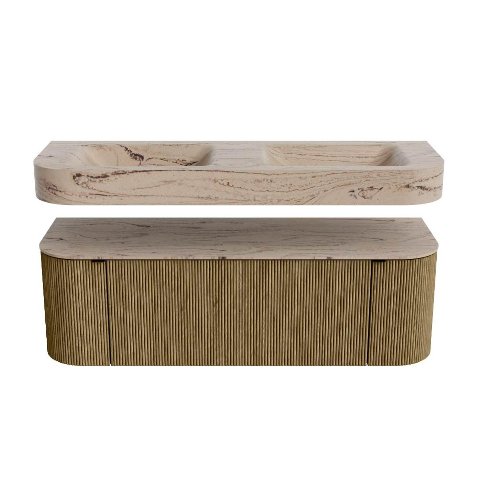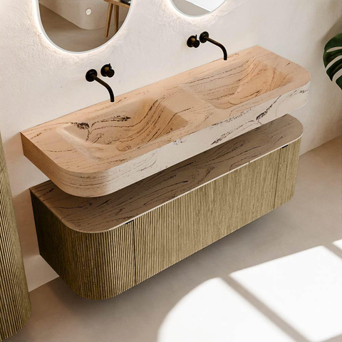 Natuurlijke materialen in warme tinten. De verticale ribbels brengen ritme en textuur in het ontwerp, terwijl het eikenhout zorgt voor een warme, ambachtelijke uitstraling. Kies uit 5 houttinten OAK, WALNUT, DUSK, SHADOW en RUBY zorgvuldig geselecteerde houtkleuren om zowel moderne als klassieke badkamers te verrijken.