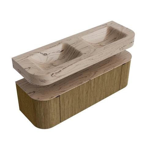 MONDIAZ THOR-DLUX 140cm badmeubel ronding links + rechts kleur Dusk met 1 lade en 2 deuren. Vrijhangende wastafel CLOUD Dubbel zonder kraangat kleur Arena.