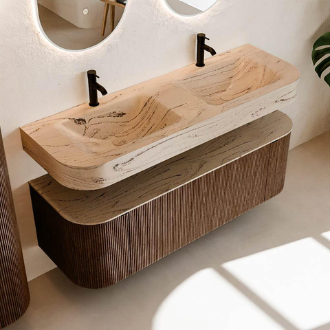 MONDIAZ THOR-DLUX 140cm badmeubel ronding links + rechts kleur Walnut met 1 lade en 2 deuren. Vrijhangende wastafel CLOUD Dubbel 2 kraangaten kleur Arena.