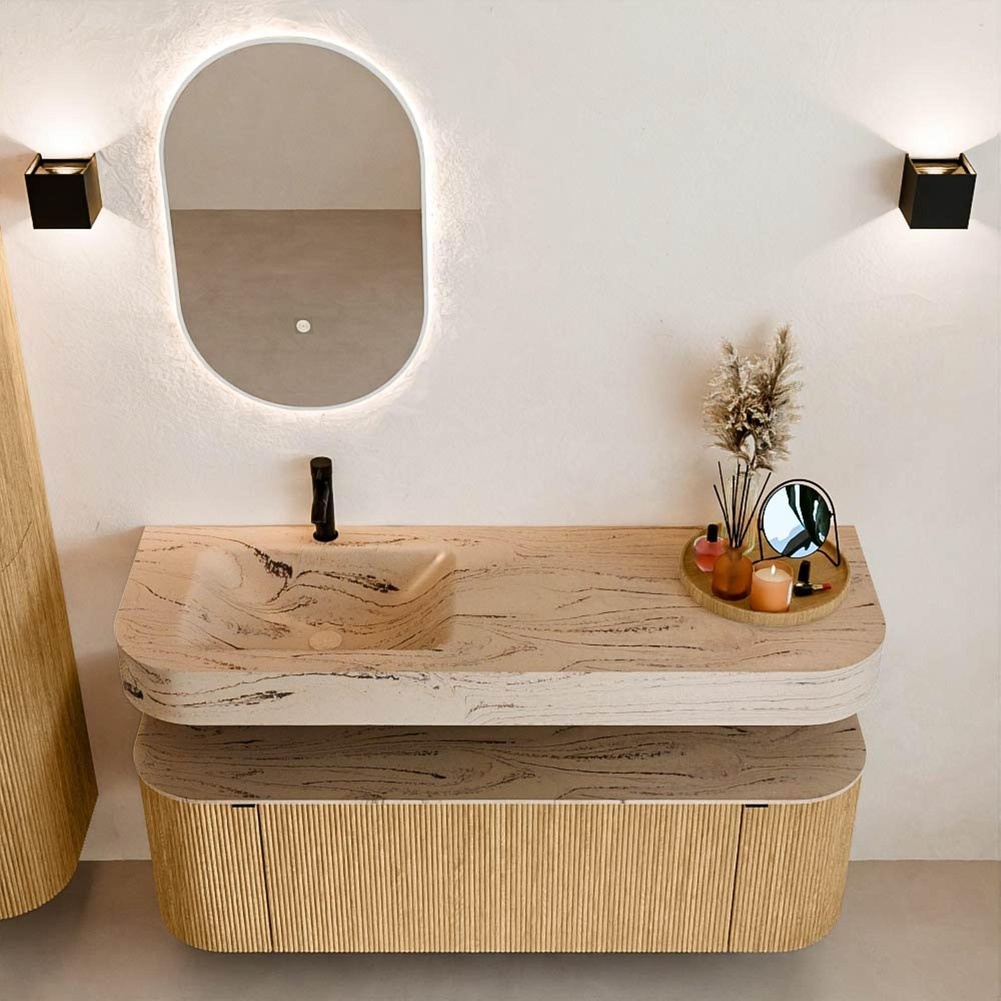 MONDIAZ THOR-DLUX 140cm badmeubel ronding links + rechts kleur Oak met 1 lade en 2 deuren. Vrijhangende wastafel CLOUD Links 1 kraangat kleur Arena.