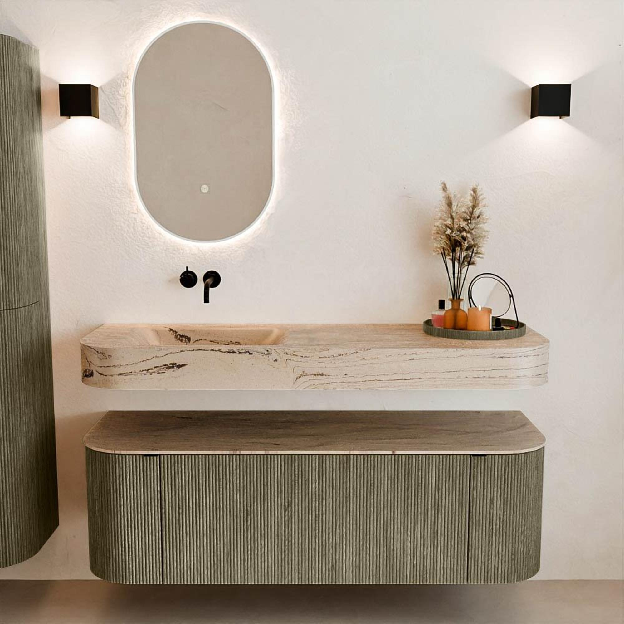Natuurlijke materialen in warme tinten. De verticale ribbels brengen ritme en textuur in het ontwerp, terwijl het eikenhout zorgt voor een warme, ambachtelijke uitstraling. Kies uit 5 houttinten OAK, WALNUT, DUSK, SHADOW en RUBY zorgvuldig geselecteerde houtkleuren om zowel moderne als klassieke badkamers te verrijken.
