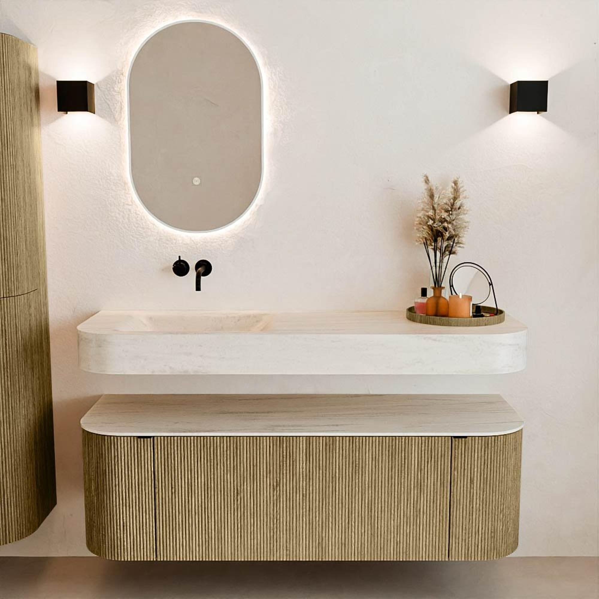 Natuurlijke materialen in warme tinten. De verticale ribbels brengen ritme en textuur in het ontwerp, terwijl het eikenhout zorgt voor een warme, ambachtelijke uitstraling. Kies uit 5 houttinten OAK, WALNUT, DUSK, SHADOW en RUBY zorgvuldig geselecteerde houtkleuren om zowel moderne als klassieke badkamers te verrijken.