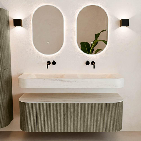 Natuurlijke materialen in warme tinten. De verticale ribbels brengen ritme en textuur in het ontwerp, terwijl het eikenhout zorgt voor een warme, ambachtelijke uitstraling. Kies uit 5 houttinten OAK, WALNUT, DUSK, SHADOW en RUBY zorgvuldig geselecteerde houtkleuren om zowel moderne als klassieke badkamers te verrijken.