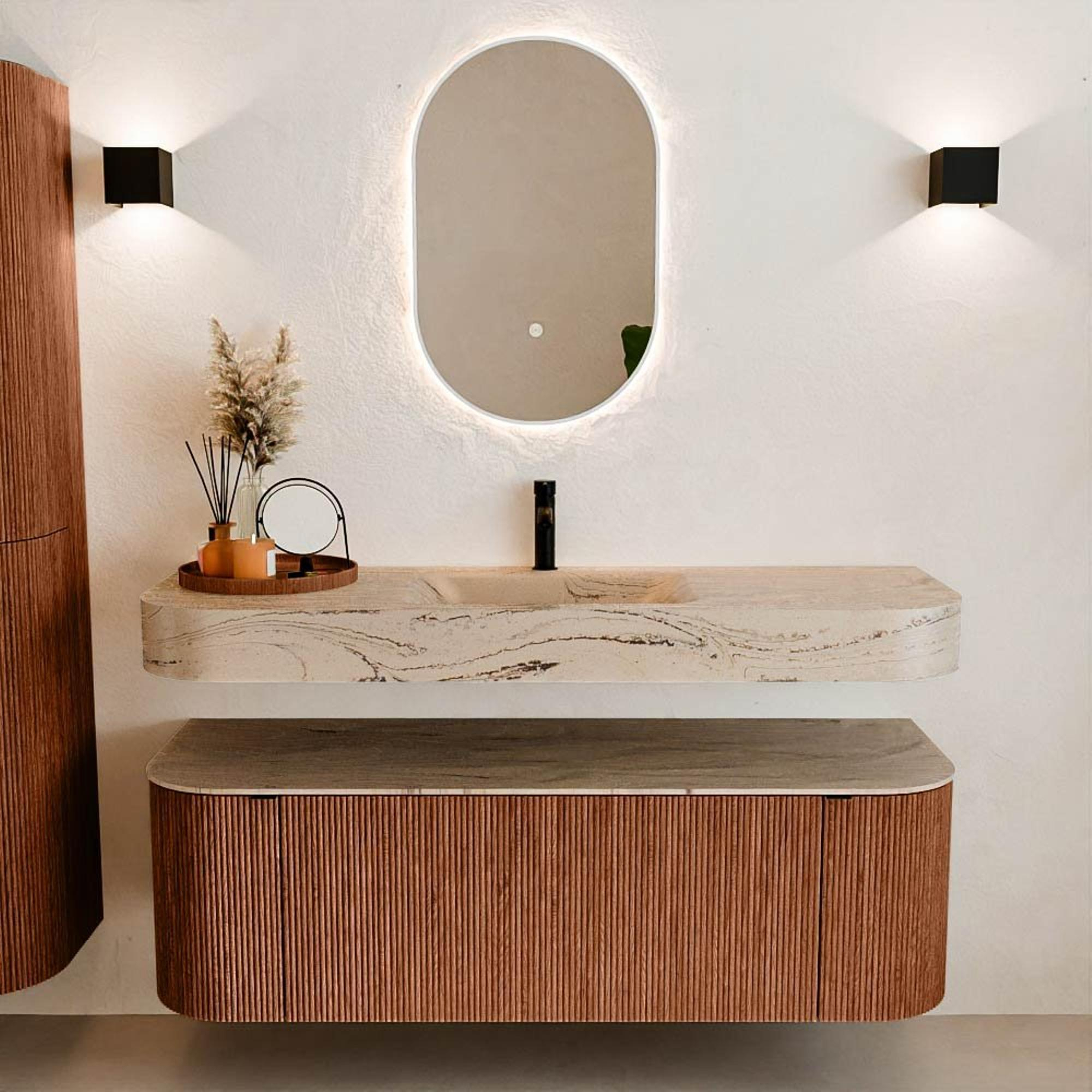 Natuurlijke materialen in warme tinten. De verticale ribbels brengen ritme en textuur in het ontwerp, terwijl het eikenhout zorgt voor een warme, ambachtelijke uitstraling. Kies uit 5 houttinten OAK, WALNUT, DUSK, SHADOW en RUBY zorgvuldig geselecteerde houtkleuren om zowel moderne als klassieke badkamers te verrijken.