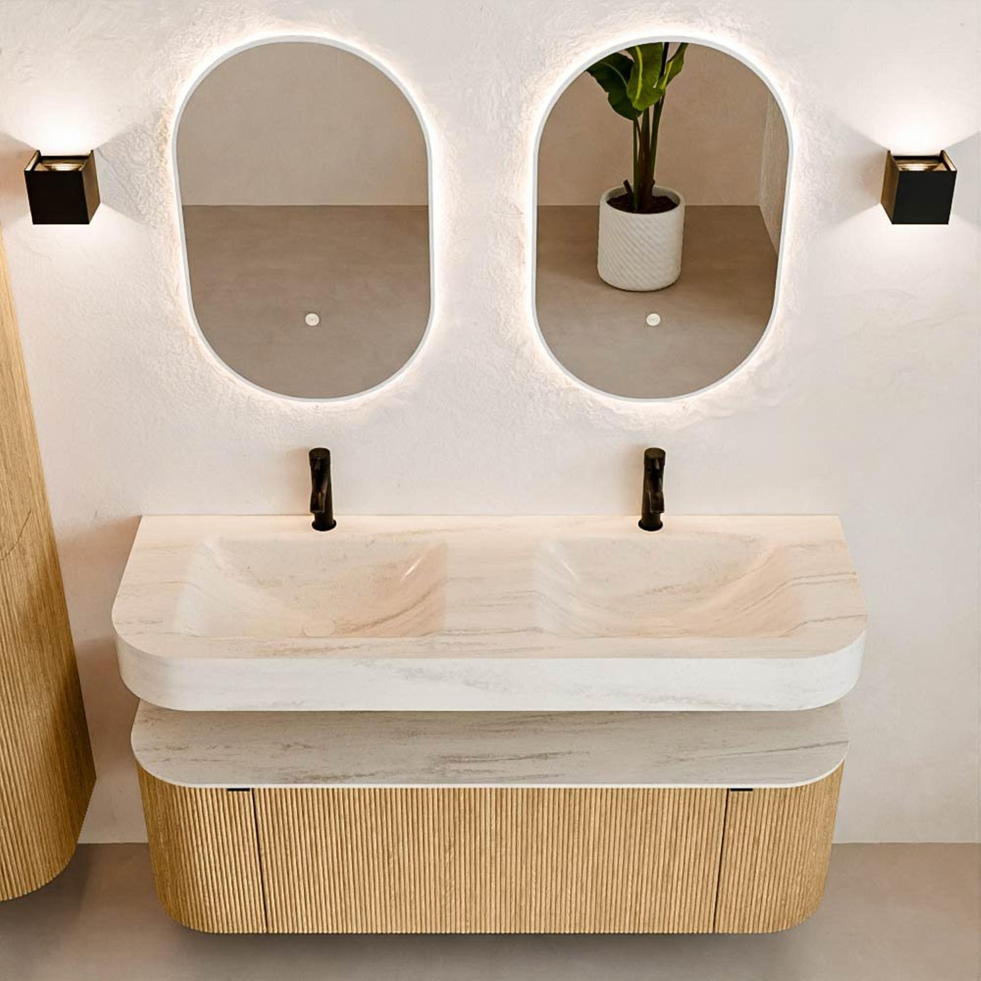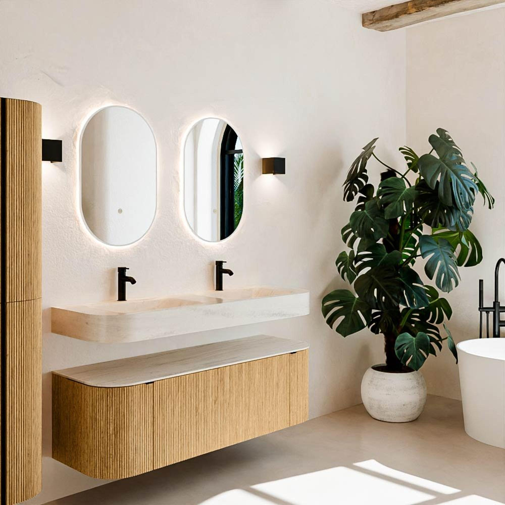 Natuurlijke materialen in warme tinten. De verticale ribbels brengen ritme en textuur in het ontwerp, terwijl het eikenhout zorgt voor een warme, ambachtelijke uitstraling. Kies uit 5 houttinten OAK, WALNUT, DUSK, SHADOW en RUBY zorgvuldig geselecteerde houtkleuren om zowel moderne als klassieke badkamers te verrijken.