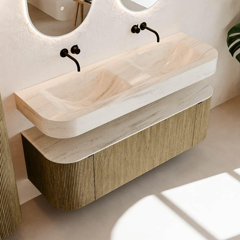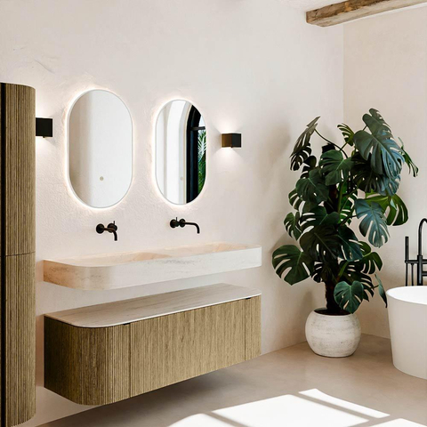 Natuurlijke materialen in warme tinten. De verticale ribbels brengen ritme en textuur in het ontwerp, terwijl het eikenhout zorgt voor een warme, ambachtelijke uitstraling. Kies uit 5 houttinten OAK, WALNUT, DUSK, SHADOW en RUBY zorgvuldig geselecteerde houtkleuren om zowel moderne als klassieke badkamers te verrijken.