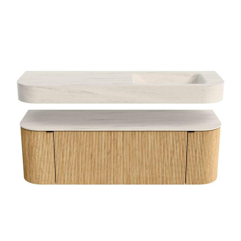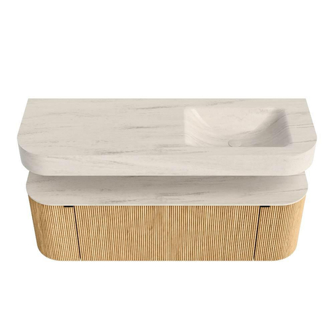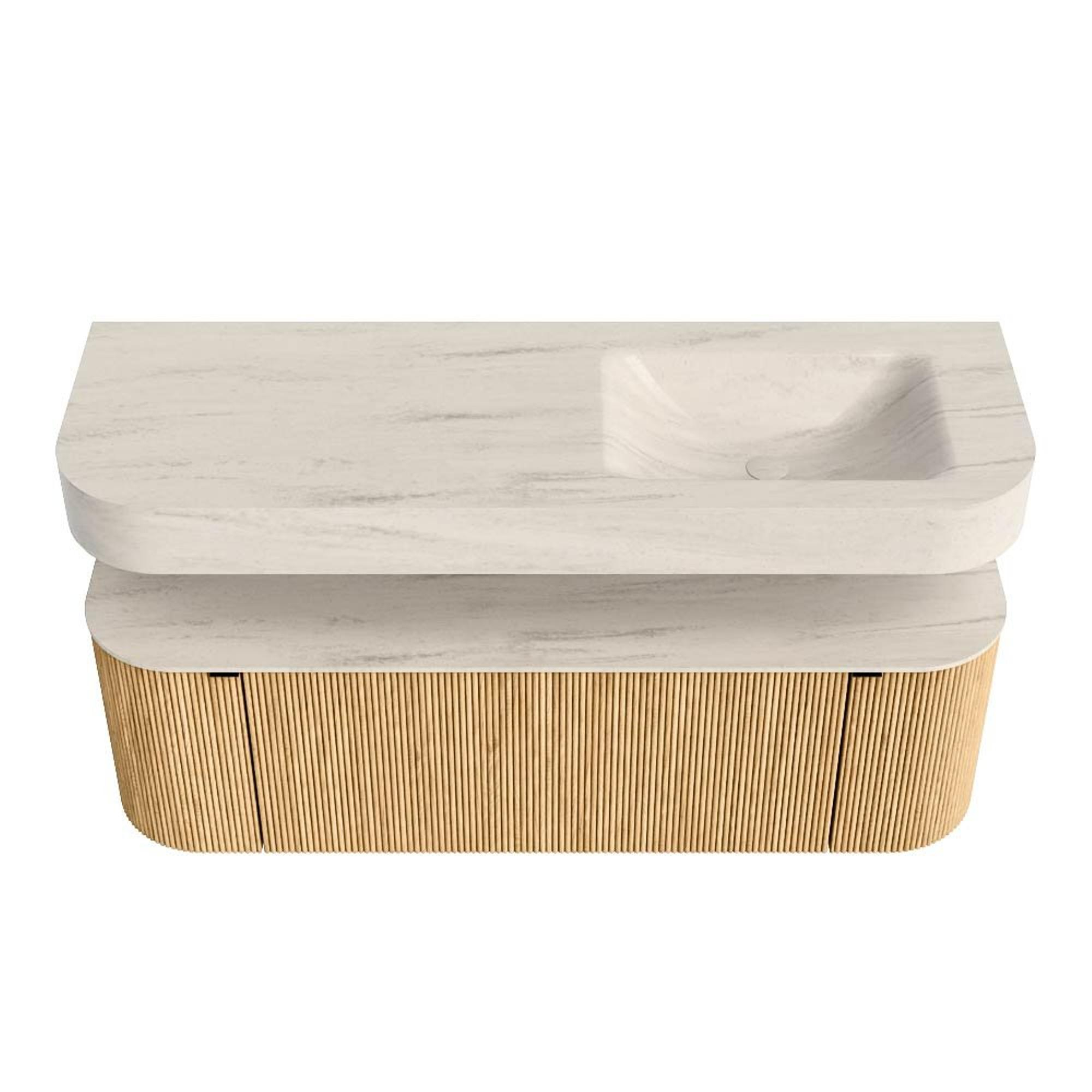 MONDIAZ THOR-DLUX 140cm badmeubel ronding links + rechts kleur Oak met 1 lade en 2 deuren. Vrijhangende wastafel CLOUD Rechts 1 kraangat kleur Meli.