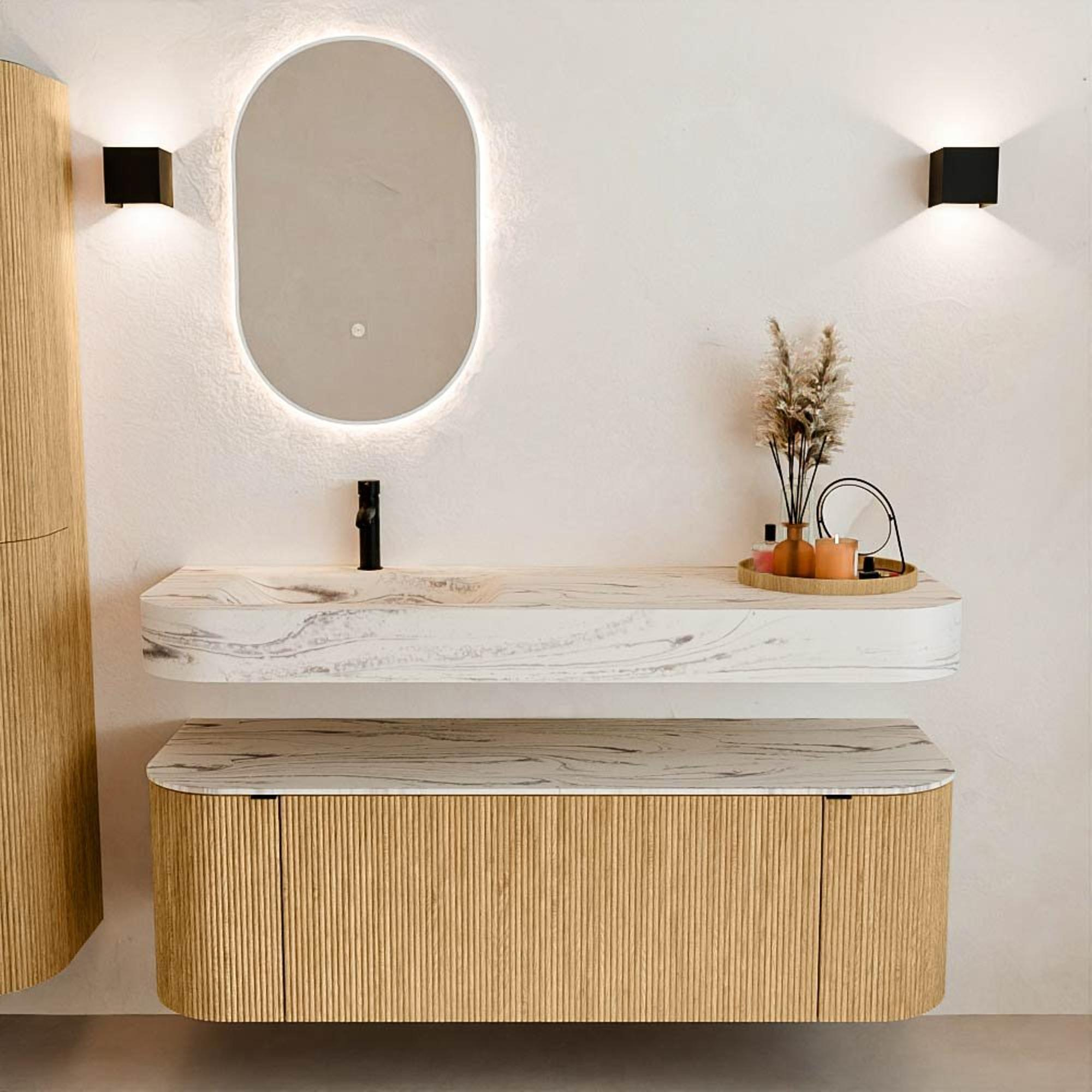 Natuurlijke materialen in warme tinten. De verticale ribbels brengen ritme en textuur in het ontwerp, terwijl het eikenhout zorgt voor een warme, ambachtelijke uitstraling. Kies uit 5 houttinten OAK, WALNUT, DUSK, SHADOW en RUBY zorgvuldig geselecteerde houtkleuren om zowel moderne als klassieke badkamers te verrijken.