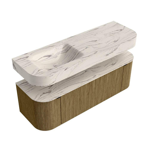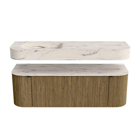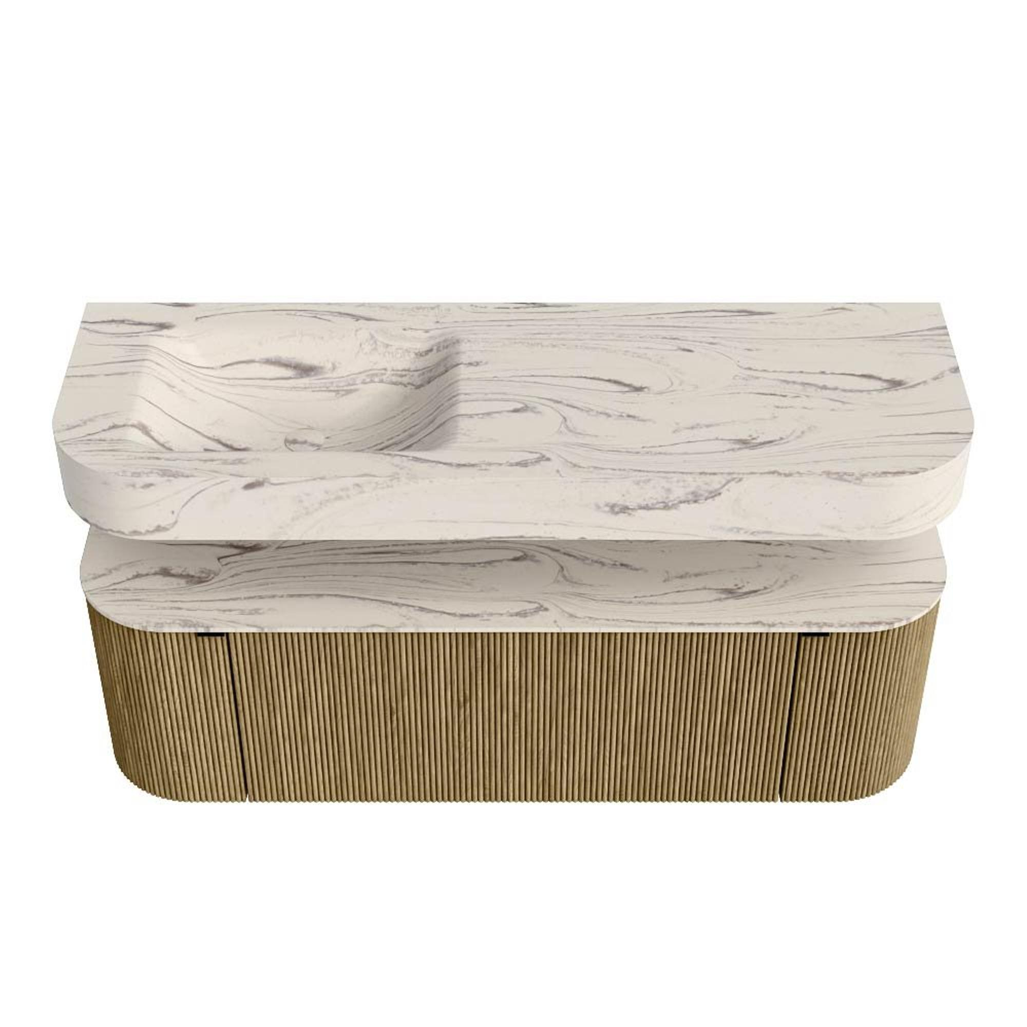 Boven het meubel zweeft een bijpassende, vrij hangende wastafel met afgeronde hoeken – perfect afgestemd op de vorm van de kast. De wastafel is uitgevoerd in Solid Surface en volgt subtiel de lijnen van het onderliggende meubel, waardoor een harmonieus geheel ontstaat. Het Solid Surface topblad vormt een sterke, onderhoudsvriendelijke basis en maakt de combinatie compleet.