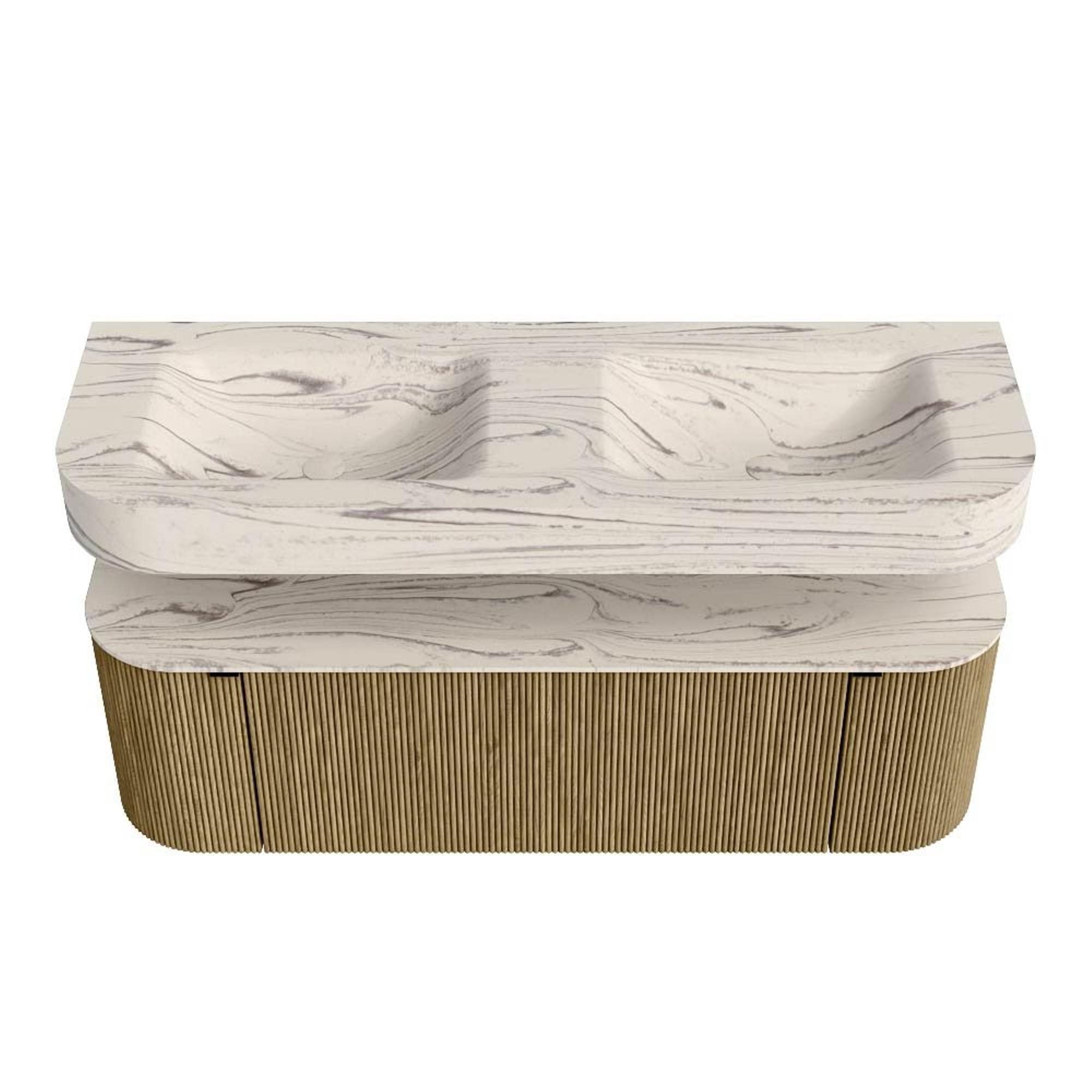 MONDIAZ THOR-DLUX 140cm badmeubel ronding links + rechts kleur Dusk met 1 lade en 2 deuren. Vrijhangende wastafel CLOUD Dubbel zonder kraangat kleur Nata.