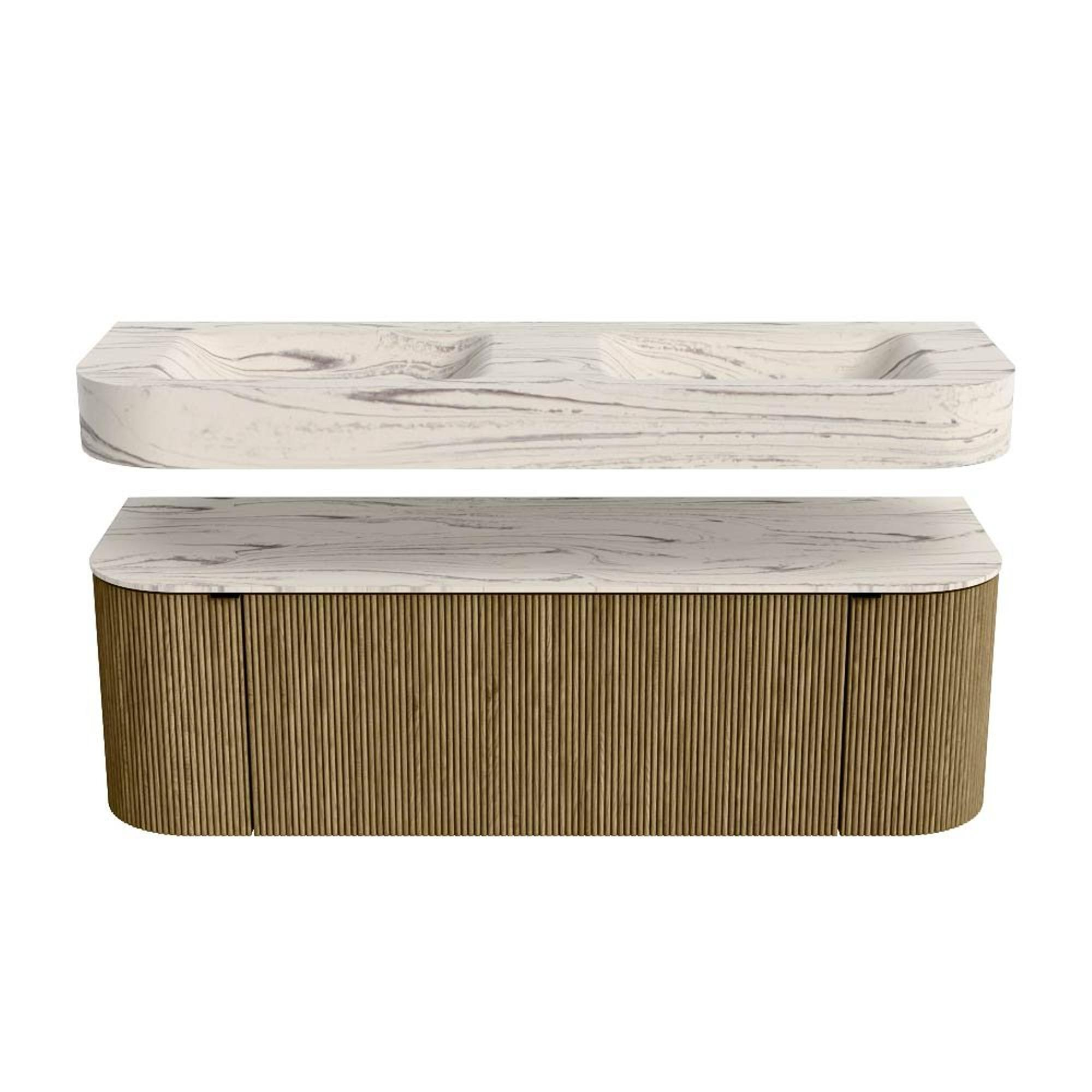 Boven het meubel zweeft een bijpassende, vrij hangende wastafel met afgeronde hoeken – perfect afgestemd op de vorm van de kast. De wastafel is uitgevoerd in Solid Surface en volgt subtiel de lijnen van het onderliggende meubel, waardoor een harmonieus geheel ontstaat. Het Solid Surface topblad vormt een sterke, onderhoudsvriendelijke basis en maakt de combinatie compleet.