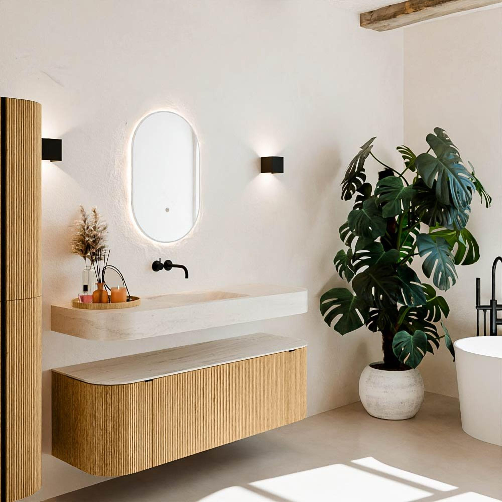Natuurlijke materialen in warme tinten. De verticale ribbels brengen ritme en textuur in het ontwerp, terwijl het eikenhout zorgt voor een warme, ambachtelijke uitstraling. Kies uit 5 houttinten OAK, WALNUT, DUSK, SHADOW en RUBY zorgvuldig geselecteerde houtkleuren om zowel moderne als klassieke badkamers te verrijken.