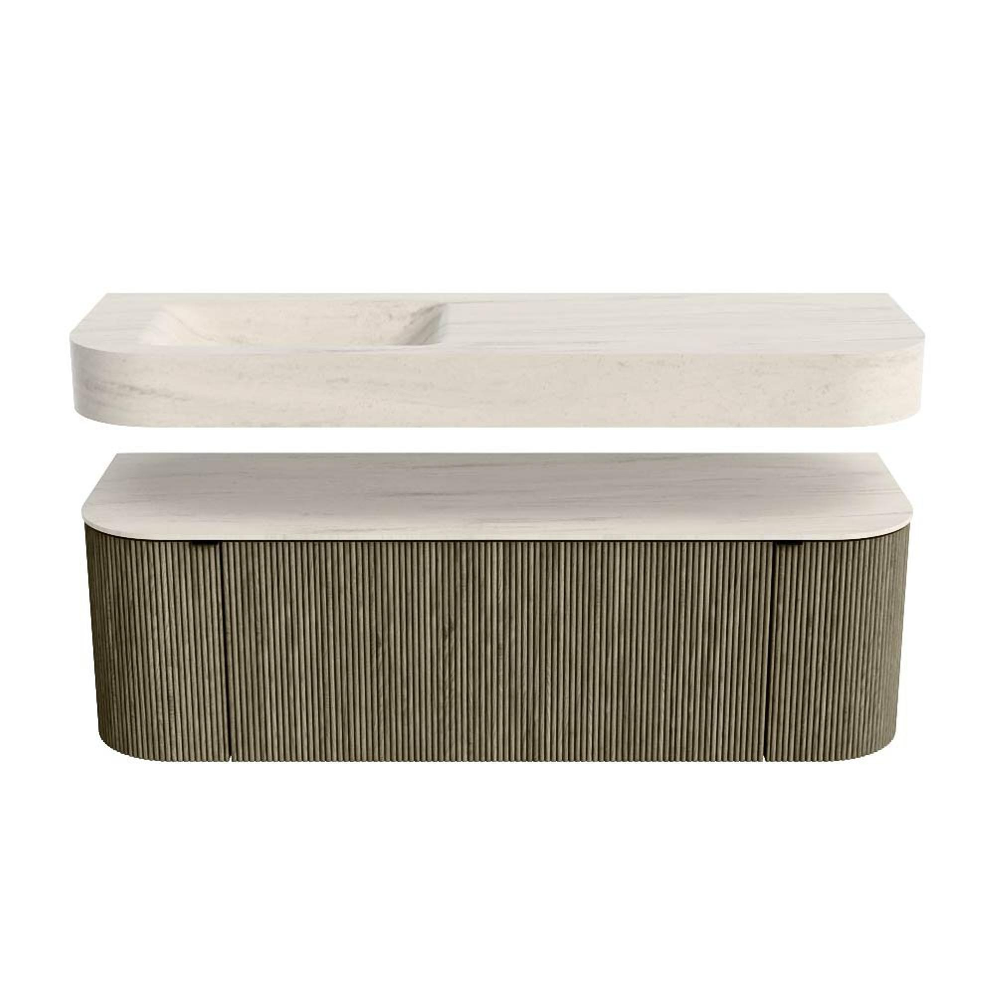 Boven het meubel zweeft een bijpassende, vrij hangende wastafel met afgeronde hoeken – perfect afgestemd op de vorm van de kast. De wastafel is uitgevoerd in Solid Surface en volgt subtiel de lijnen van het onderliggende meubel, waardoor een harmonieus geheel ontstaat. Het Solid Surface topblad vormt een sterke, onderhoudsvriendelijke basis en maakt de combinatie compleet.