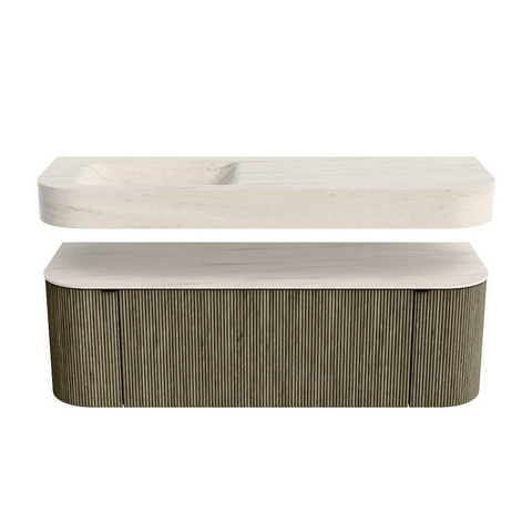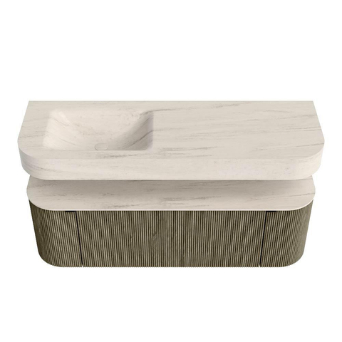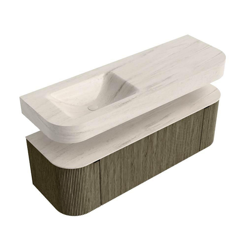 MONDIAZ THOR-DLUX 140cm badmeubel ronding links + rechts kleur Shadow met 1 lade en 2 deuren. Vrijhangende wastafel CLOUD Links zonder kraangat kleur Meli.