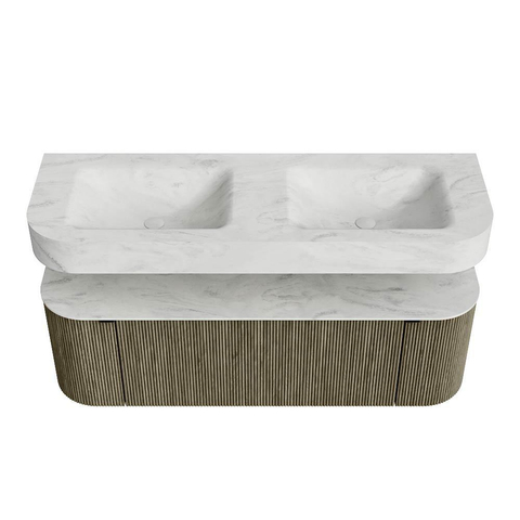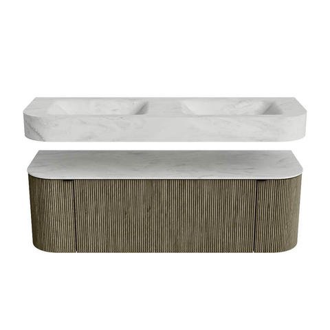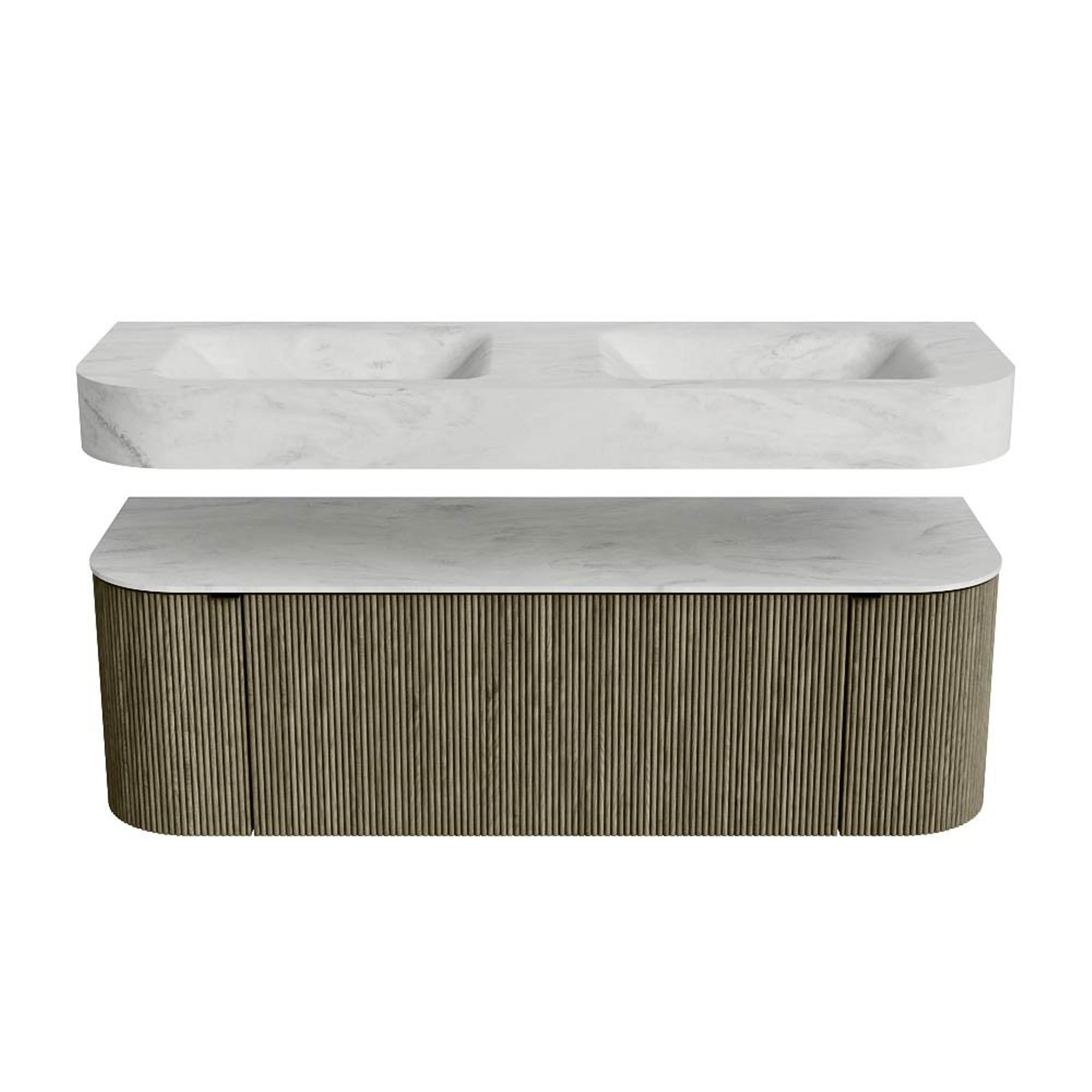 MONDIAZ THOR-DLUX 140cm badmeubel ronding links + rechts kleur Shadow met 1 lade en 2 deuren. Vrijhangende wastafel CLOUD Dubbel 2 kraangaten kleur Opalo.