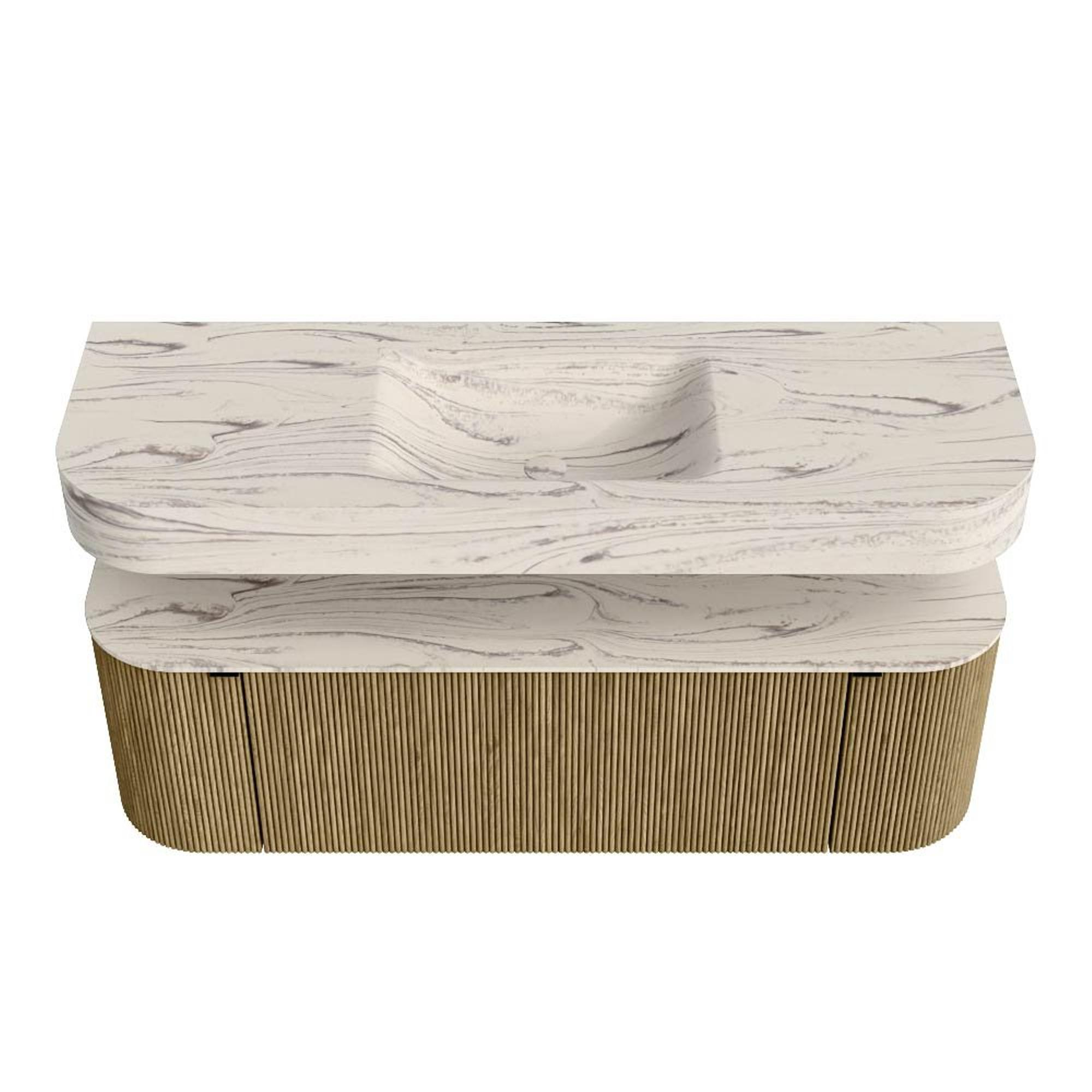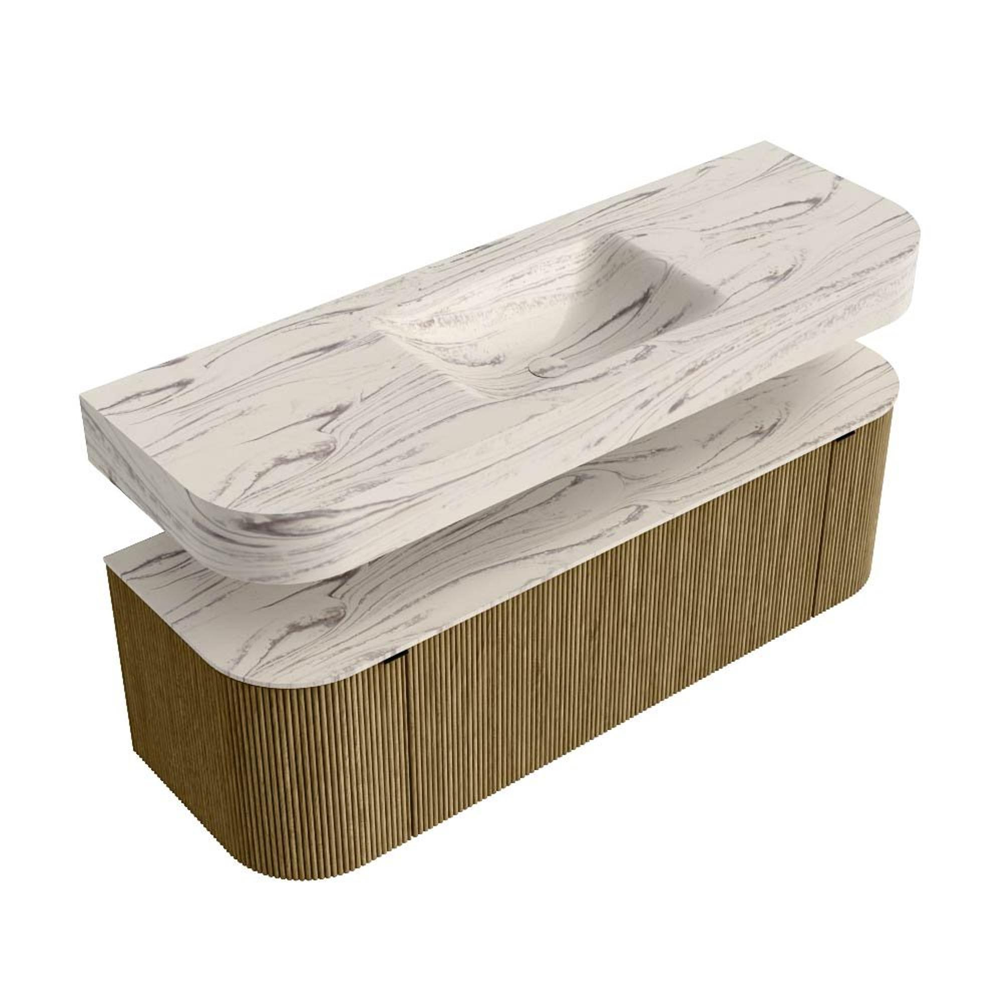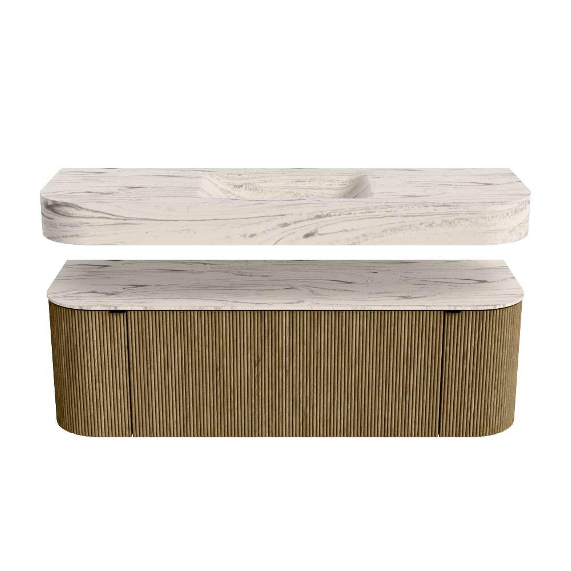Boven het meubel zweeft een bijpassende, vrij hangende wastafel met afgeronde hoeken – perfect afgestemd op de vorm van de kast. De wastafel is uitgevoerd in Solid Surface en volgt subtiel de lijnen van het onderliggende meubel, waardoor een harmonieus geheel ontstaat. Het Solid Surface topblad vormt een sterke, onderhoudsvriendelijke basis en maakt de combinatie compleet.