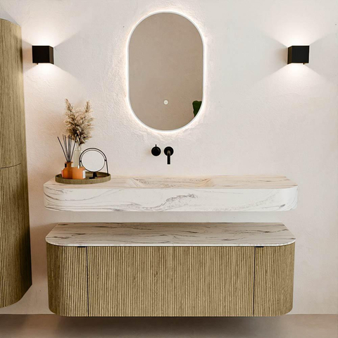 Natuurlijke materialen in warme tinten. De verticale ribbels brengen ritme en textuur in het ontwerp, terwijl het eikenhout zorgt voor een warme, ambachtelijke uitstraling. Kies uit 5 houttinten OAK, WALNUT, DUSK, SHADOW en RUBY zorgvuldig geselecteerde houtkleuren om zowel moderne als klassieke badkamers te verrijken.