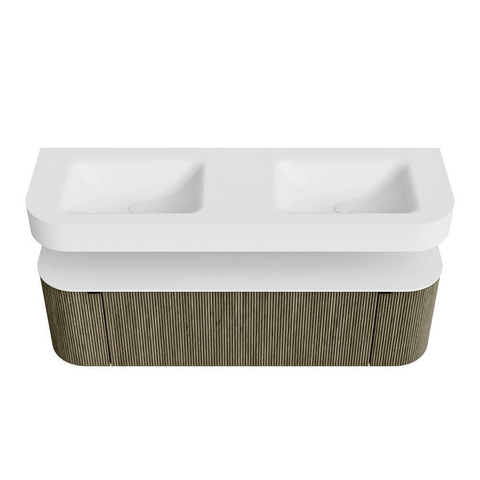 Boven het meubel zweeft een bijpassende, vrij hangende wastafel met afgeronde hoeken – perfect afgestemd op de vorm van de kast. De wastafel is uitgevoerd in Solid Surface en volgt subtiel de lijnen van het onderliggende meubel, waardoor een harmonieus geheel ontstaat. Het Solid Surface topblad vormt een sterke, onderhoudsvriendelijke basis en maakt de combinatie compleet.
