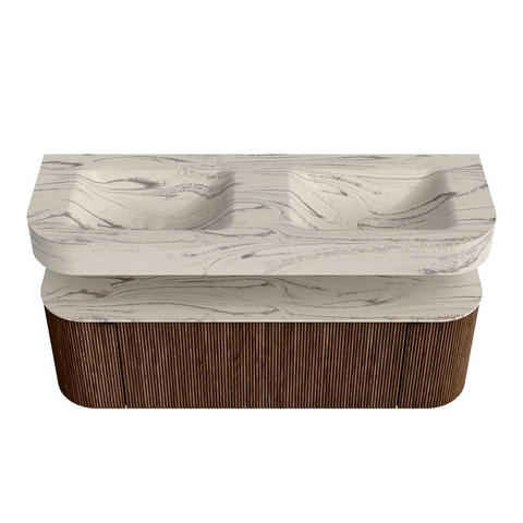 MONDIAZ THOR-DLUX 140cm badmeubel ronding links + rechts kleur Walnut met 1 lade en 2 deuren. Vrijhangende wastafel CLOUD Dubbel 2 kraangaten kleur Nata.