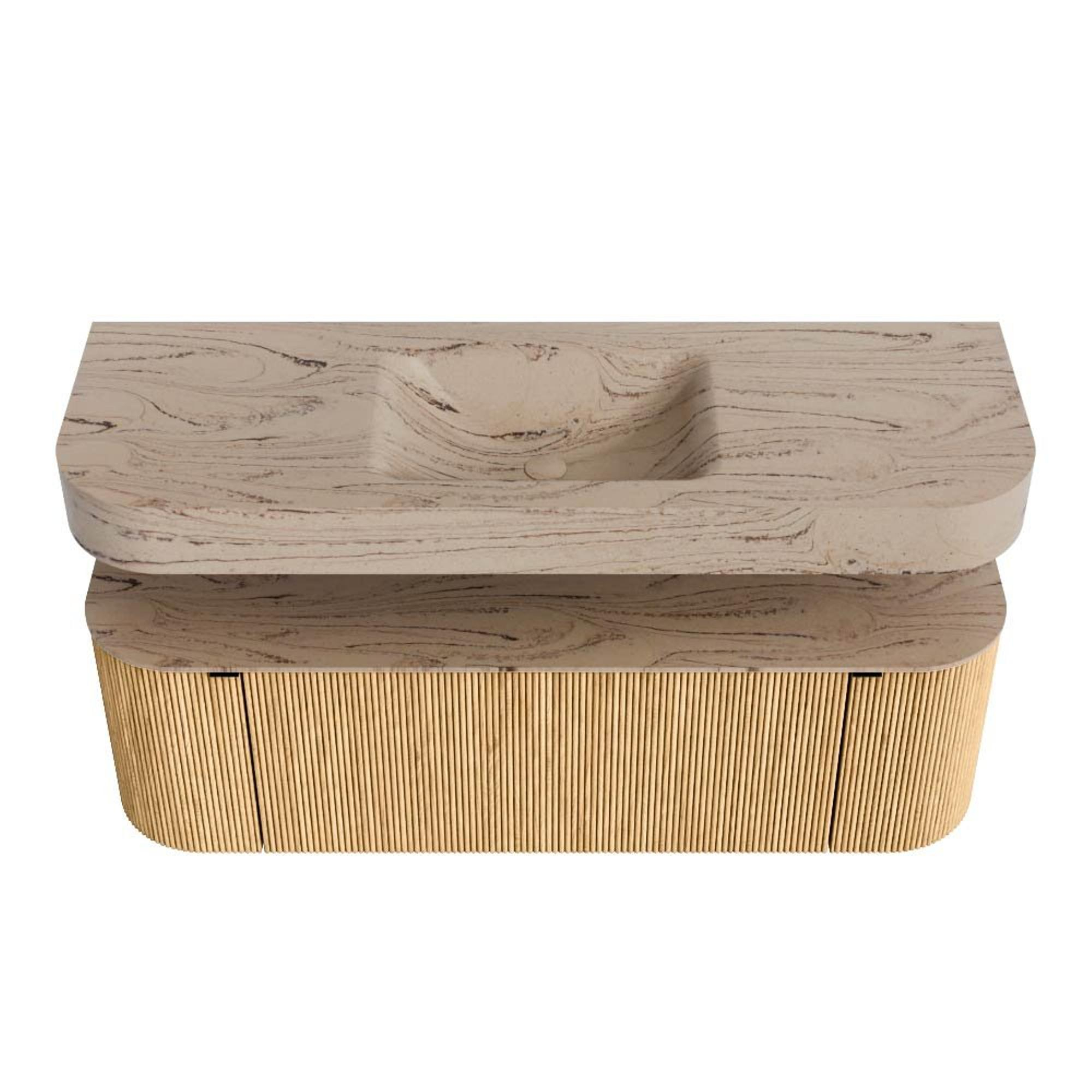 Boven het meubel zweeft een bijpassende, vrij hangende wastafel met afgeronde hoeken – perfect afgestemd op de vorm van de kast. De wastafel is uitgevoerd in Solid Surface en volgt subtiel de lijnen van het onderliggende meubel, waardoor een harmonieus geheel ontstaat. Het Solid Surface topblad vormt een sterke, onderhoudsvriendelijke basis en maakt de combinatie compleet.