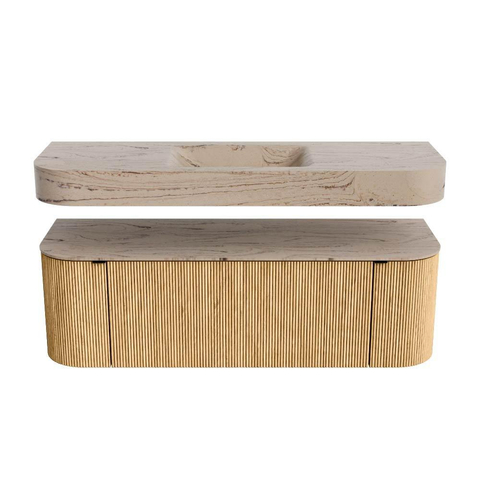 MONDIAZ THOR-DLUX 140cm badmeubel ronding links + rechts kleur Oak met 1 lade en 2 deuren. Vrijhangende wastafel CLOUD Midden 1 kraangat kleur Arena.