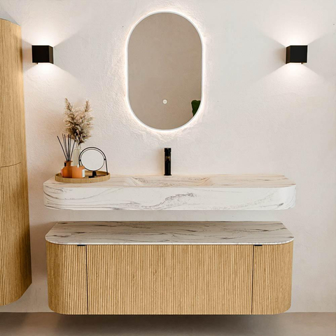 Natuurlijke materialen in warme tinten. De verticale ribbels brengen ritme en textuur in het ontwerp, terwijl het eikenhout zorgt voor een warme, ambachtelijke uitstraling. Kies uit 5 houttinten OAK, WALNUT, DUSK, SHADOW en RUBY zorgvuldig geselecteerde houtkleuren om zowel moderne als klassieke badkamers te verrijken.