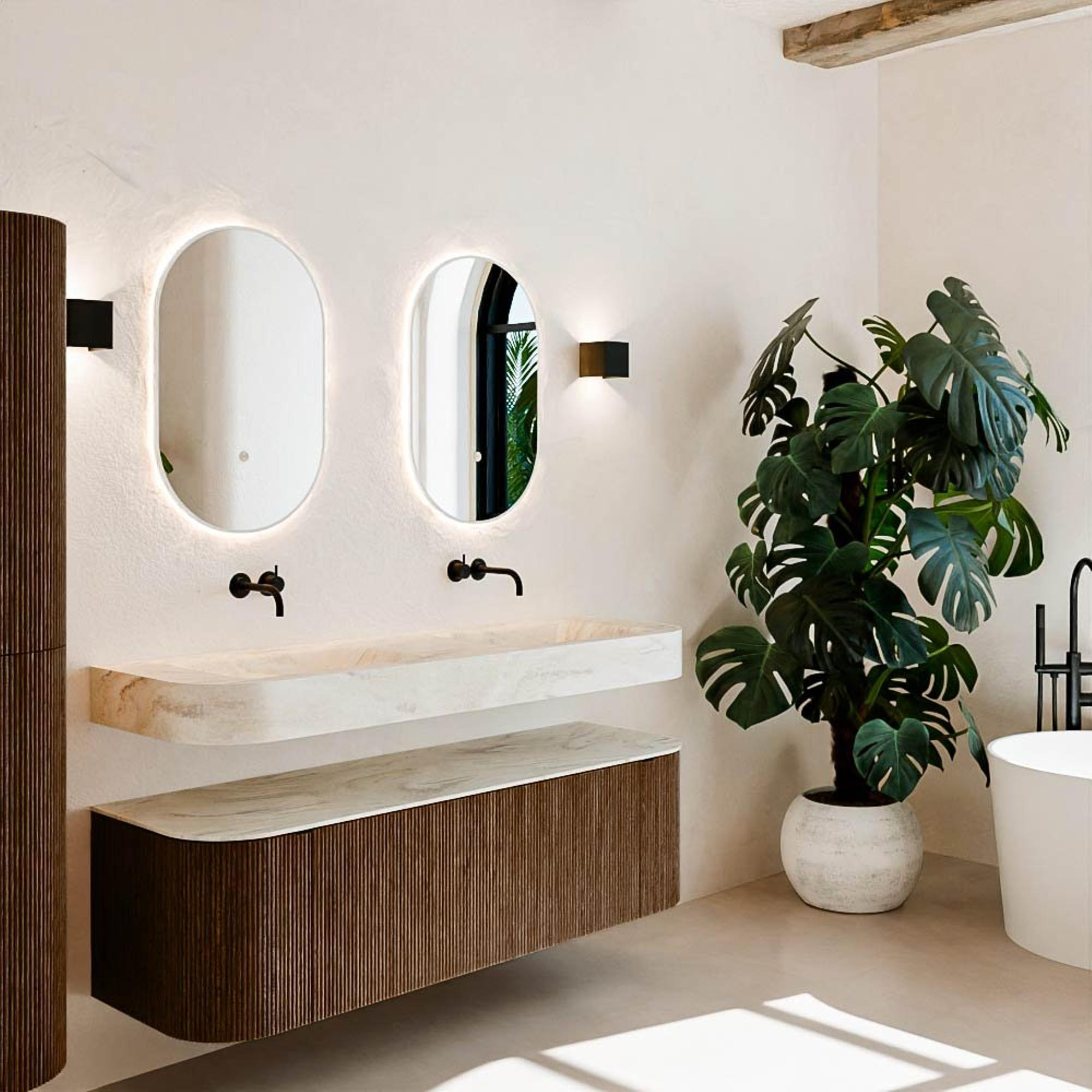 Natuurlijke materialen in warme tinten. De verticale ribbels brengen ritme en textuur in het ontwerp, terwijl het eikenhout zorgt voor een warme, ambachtelijke uitstraling. Kies uit 5 houttinten OAK, WALNUT, DUSK, SHADOW en RUBY zorgvuldig geselecteerde houtkleuren om zowel moderne als klassieke badkamers te verrijken.