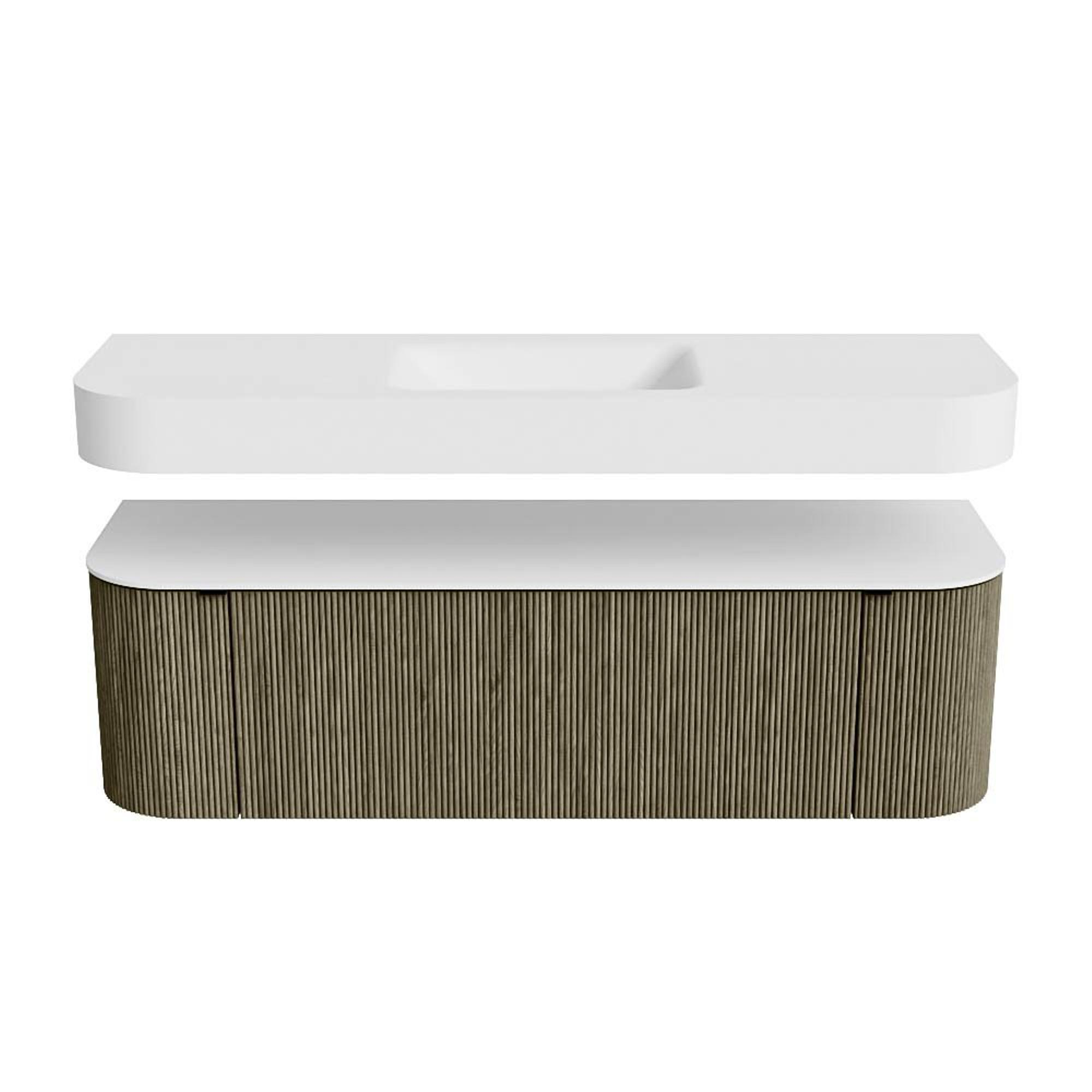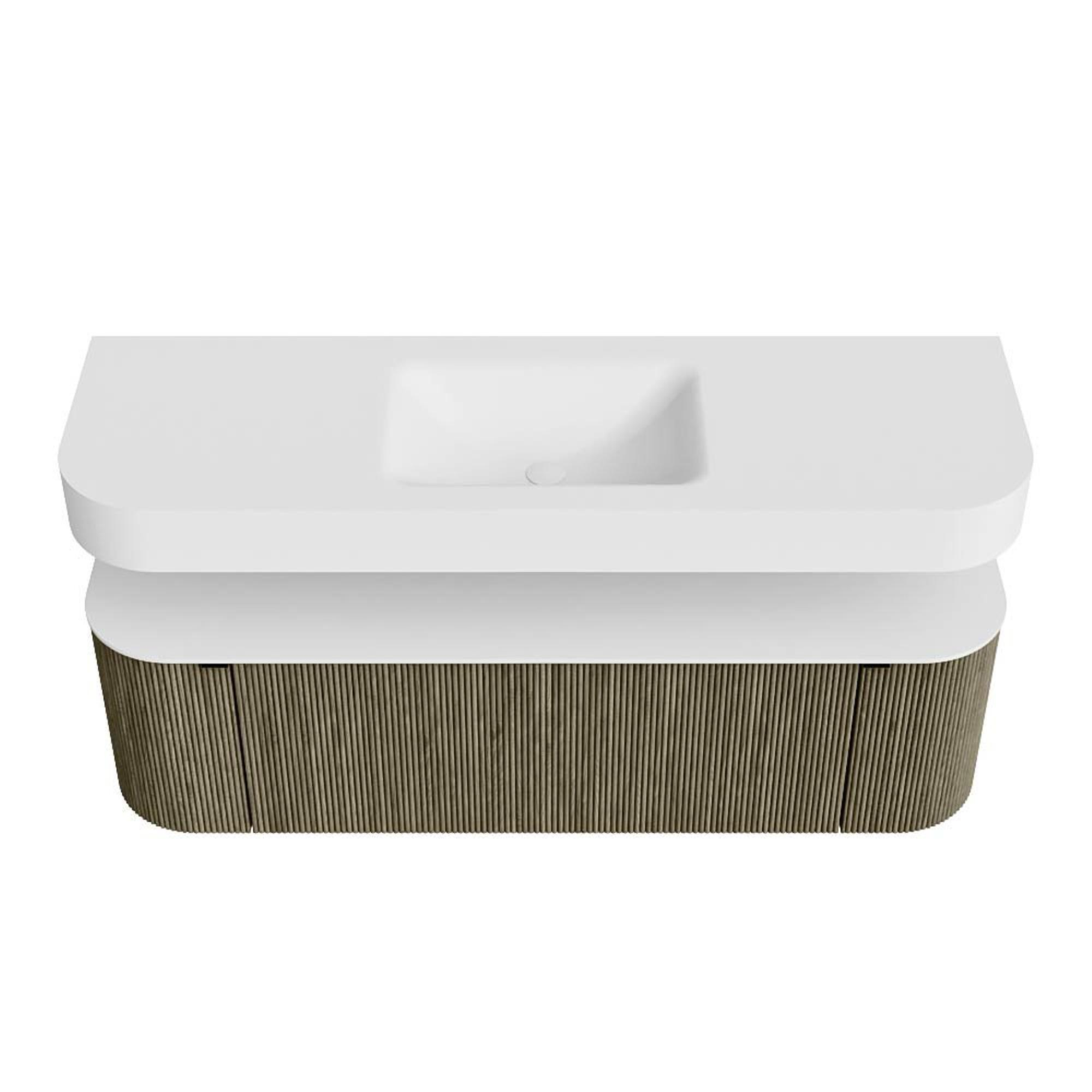 Boven het meubel zweeft een bijpassende, vrij hangende wastafel met afgeronde hoeken – perfect afgestemd op de vorm van de kast. De wastafel is uitgevoerd in Solid Surface en volgt subtiel de lijnen van het onderliggende meubel, waardoor een harmonieus geheel ontstaat. Het Solid Surface topblad vormt een sterke, onderhoudsvriendelijke basis en maakt de combinatie compleet.