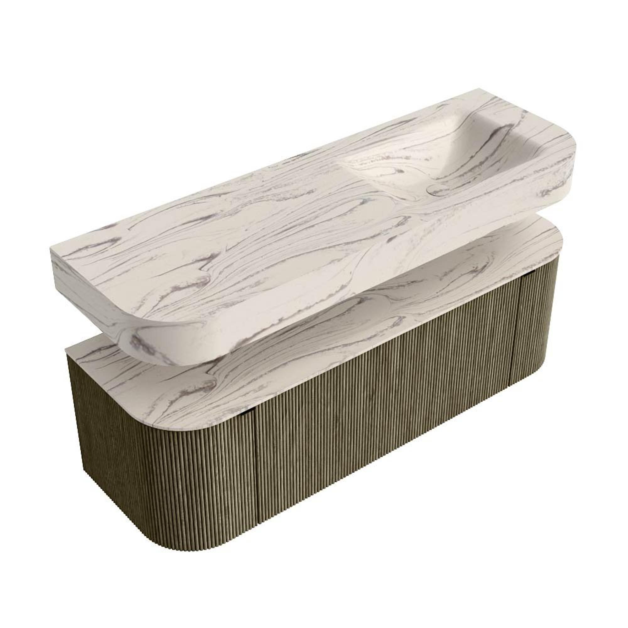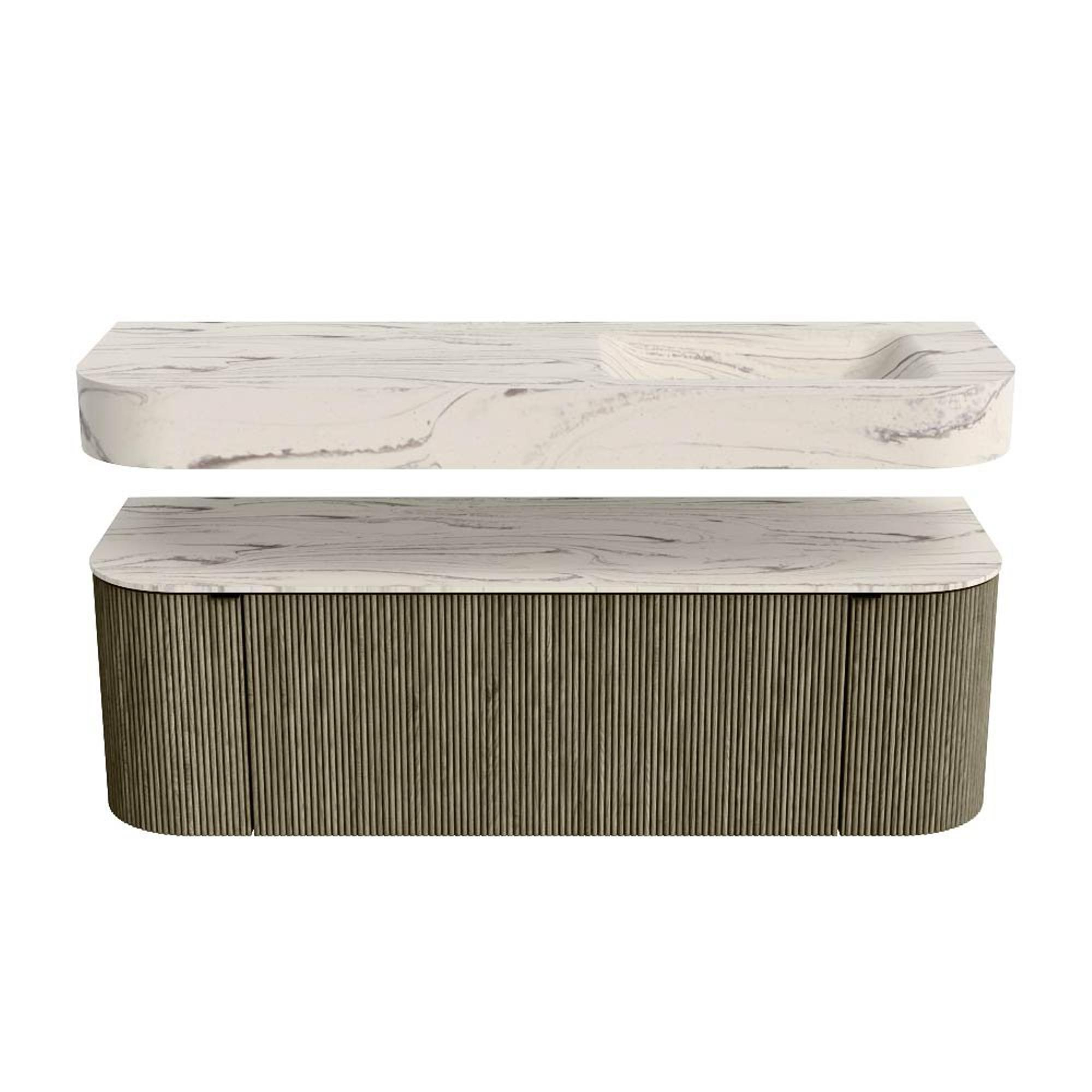 Boven het meubel zweeft een bijpassende, vrij hangende wastafel met afgeronde hoeken – perfect afgestemd op de vorm van de kast. De wastafel is uitgevoerd in Solid Surface en volgt subtiel de lijnen van het onderliggende meubel, waardoor een harmonieus geheel ontstaat. Het Solid Surface topblad vormt een sterke, onderhoudsvriendelijke basis en maakt de combinatie compleet.