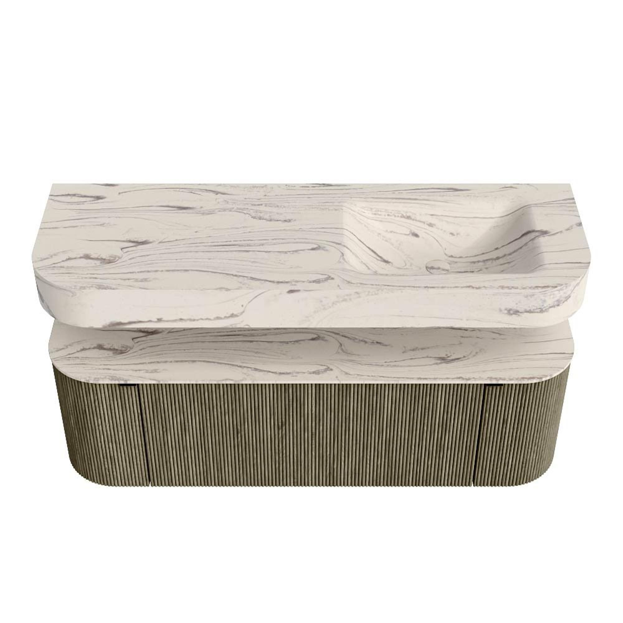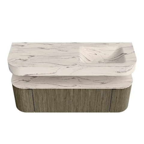 MONDIAZ THOR-DLUX 140cm badmeubel ronding links + rechts kleur Shadow met 1 lade en 2 deuren. Vrijhangende wastafel CLOUD Rechts zonder kraangat kleur Nata.