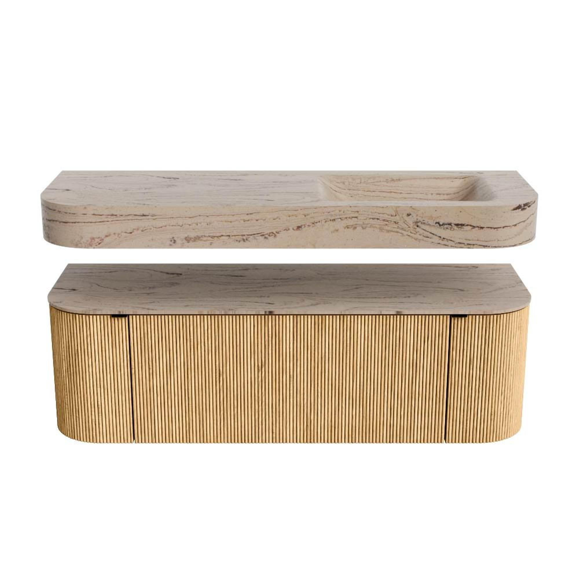 MONDIAZ THOR-DLUX 140cm badmeubel ronding links + rechts kleur Oak met 1 lade en 2 deuren. Vrijhangende wastafel CLOUD Rechts 1 kraangat kleur Arena.
