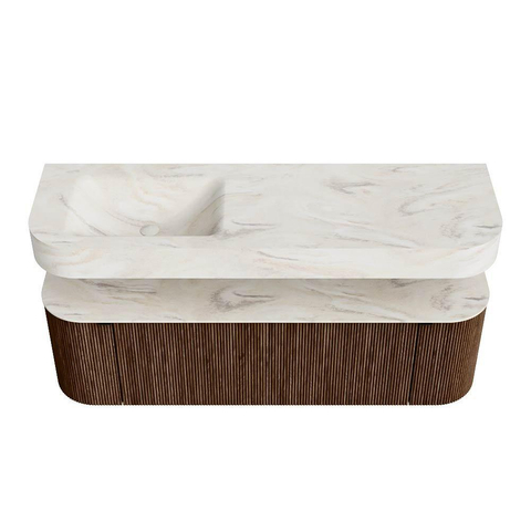 MONDIAZ THOR-DLUX 150cm badmeubel ronding links + rechts kleur Walnut met 1 lade en 2 deuren. Vrijhangende wastafel CLOUD Links 1 kraangat kleur Ostra.